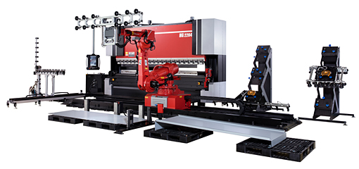 Material loading, material handling during bending, and part unloading are all performed by a single 7-axis articulated robot capable of various motions. The HG-2204Rh system can bend large parts and heavy parts without setups and can run for long hours.