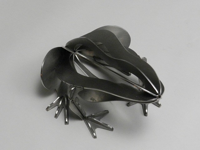 製作図面から実際に加工してみて気づいた点: 想像以上に蛙の部品点数が多く、細かい部品もあり、レーザ加工機を持たない当科では、コンターマシンで1つ1つ切断したため切断面の凹凸が多く、研磨作業が必要になったこと。