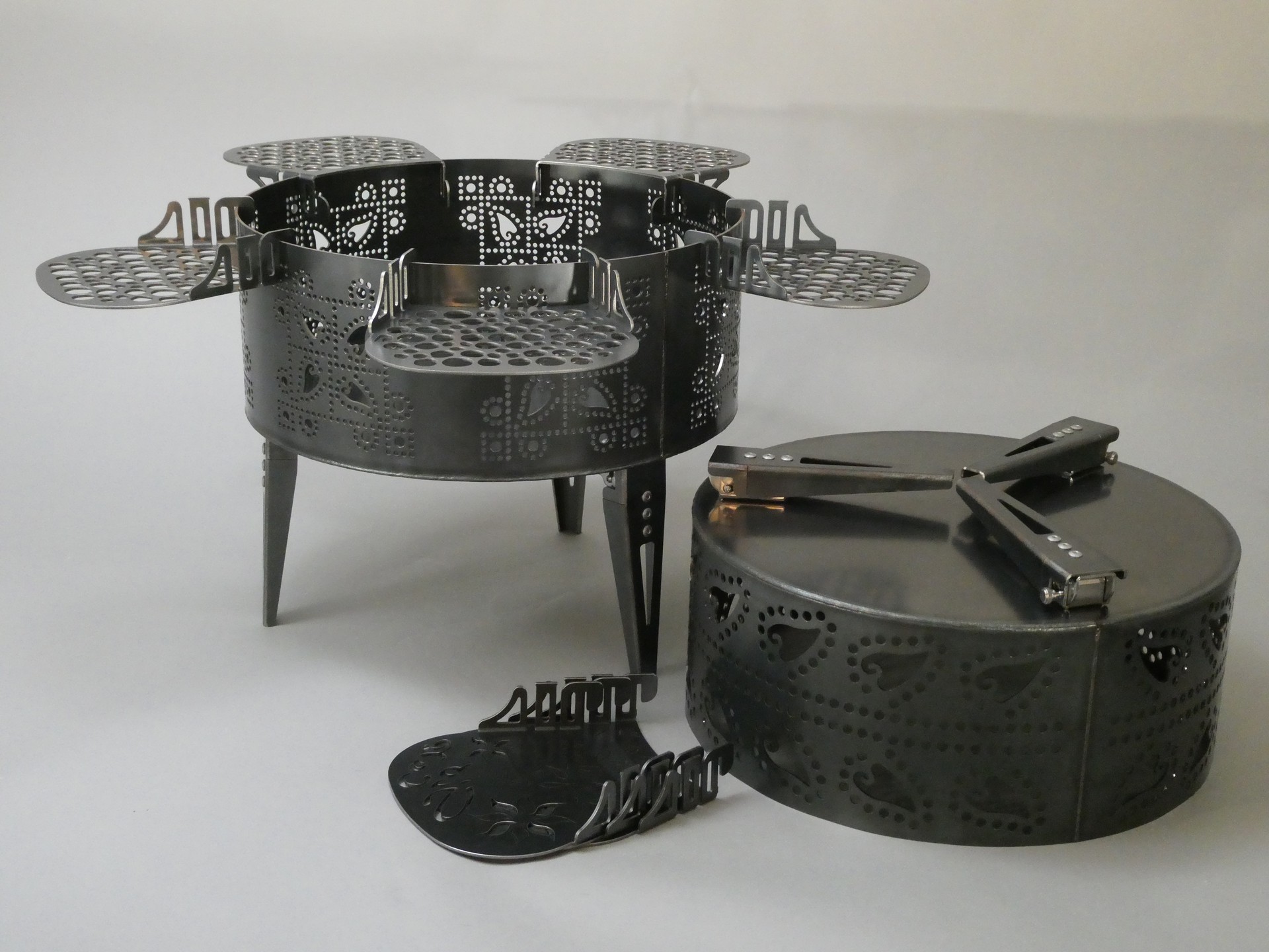 コロナ禍で社員同士や家族団らん、焚火台の周りを囲んで食事を楽しんでもらえるように大型円形型の焚火台兼屋外調理器を製作いたしました。