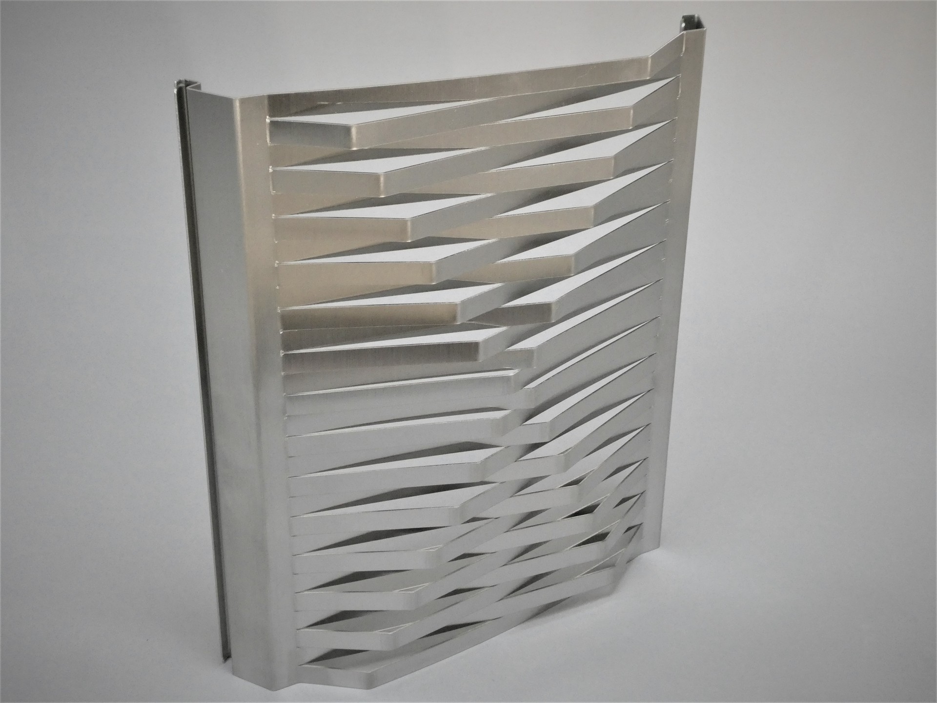 立体感を見せるため曲げ幅と高さの選定と曲げ物に沿った折り返し位置移動の起動設計に苦労した。機械(ベンダー)で板金を曲げやすくするため曲げ位置(ケガキ)を整数で表し調整を行った。