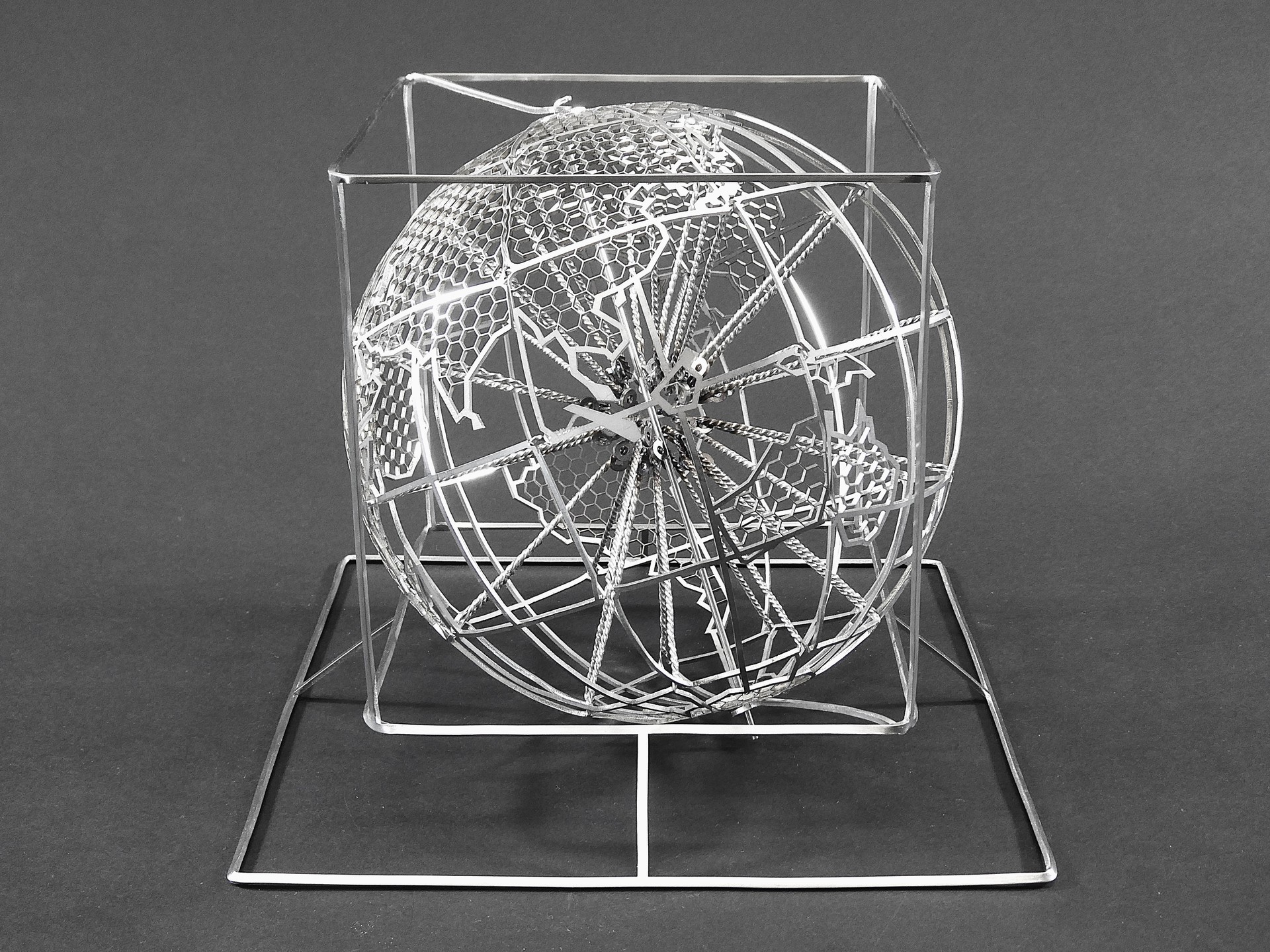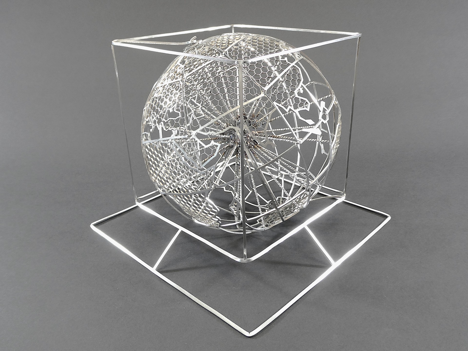この作品は、ステンレス製の一枚板を手作業で曲げて成形した「地球」と「台座」から構成されており、いずれも溶接を用いずに作り上げた点が特徴です。
