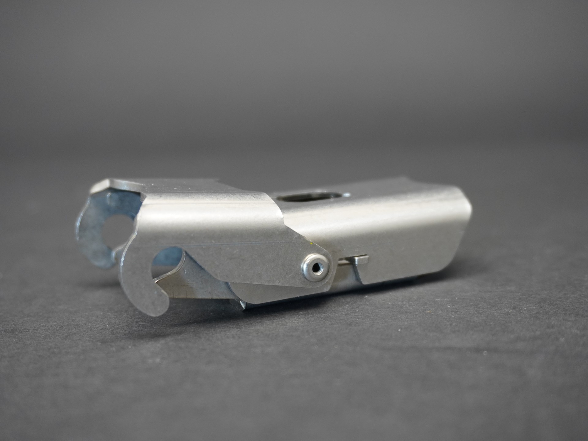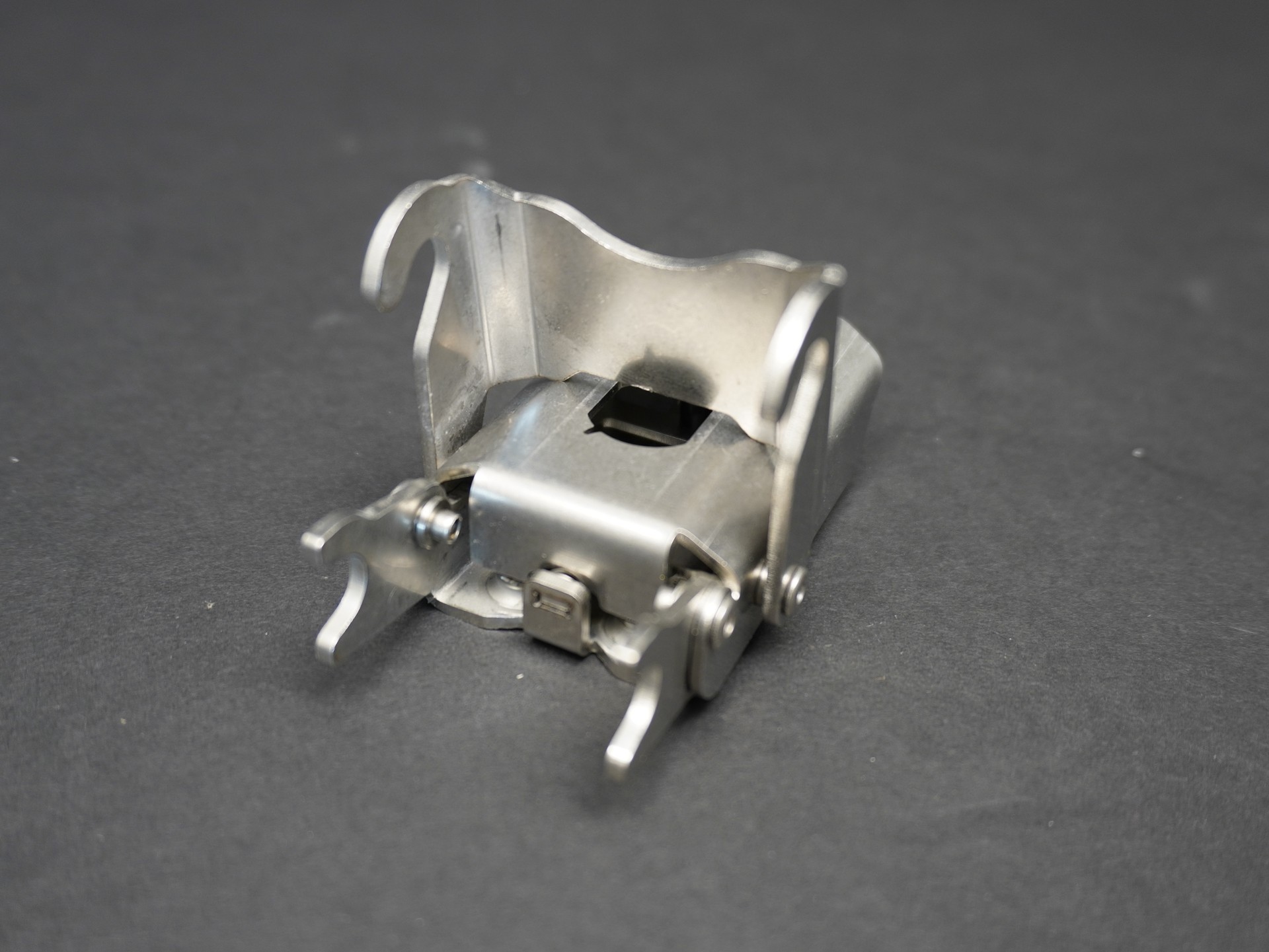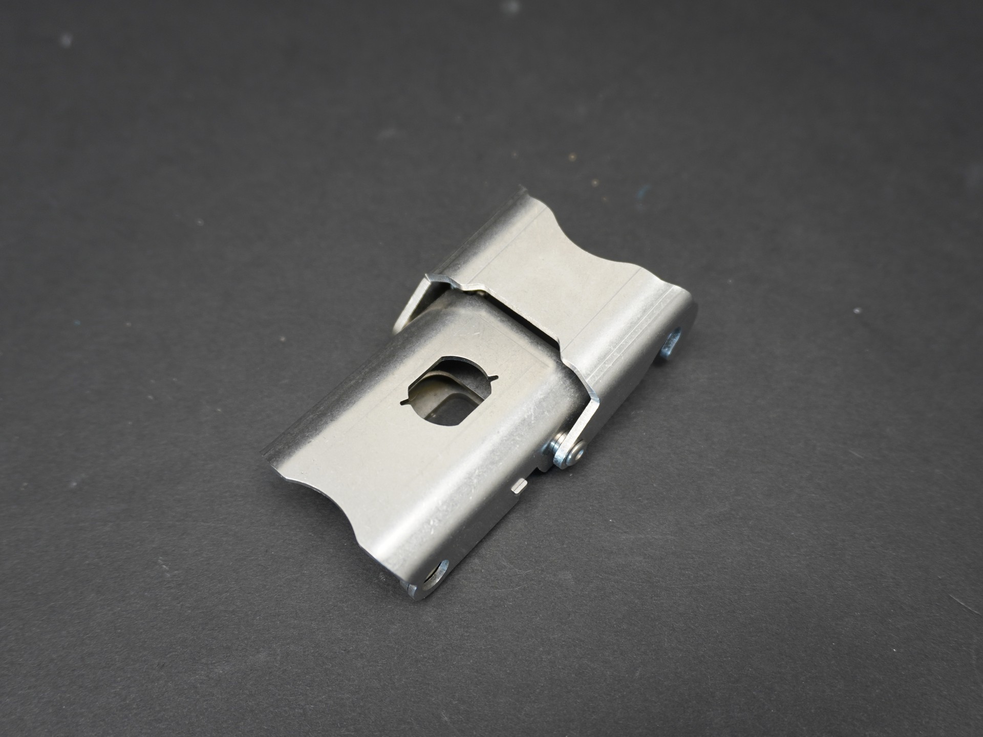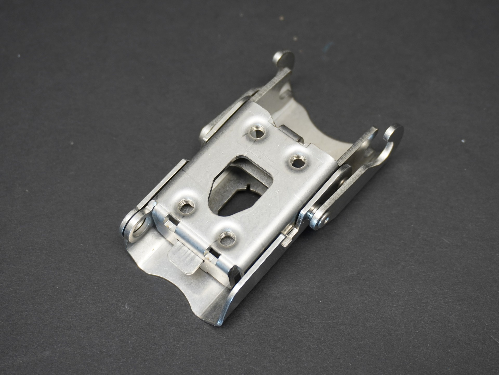 This assembly is well known among motorcycle enthusiasts and is manufactured as an OEM product for BMW, among others. It is the buckle of a motorcycle case as used on the BMW GS1200. It is a very well-designed and sophisticated part consisting only of sheet metal parts, rivets, and a spring, and is installed as such. A very attractive assembly that has been in active use for years.