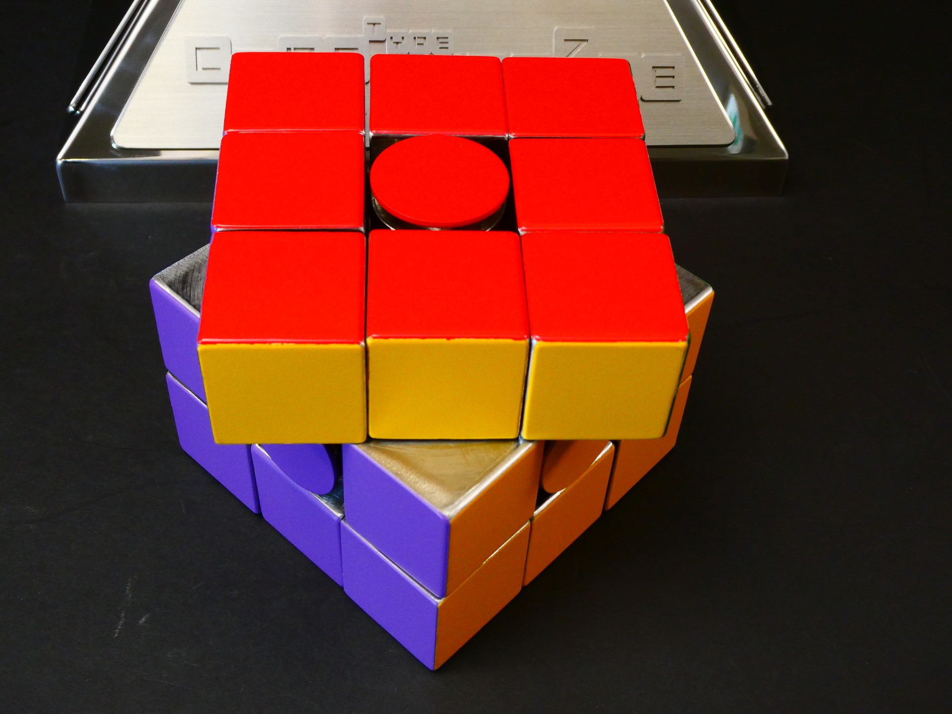 「板金でルービックキューブ製作に挑む」をコンセプトに活動を始め、約1年半かけて完成させました。最初に苦労した所は設計です。どのような構造にしたら良いのかから始まり、寸法やRの大きさ、角度等を計算、紙で何度も試作をし、その後板金にて製作しました。展開ではガタつきの調整等がとても大変でした。板金での試作品も製作していく中で検証を繰り返し、各部品の寸法や形状を細かく調整しました。3個目で動かしたときの引っ掛かりや、その他不具合を見つけ、4個目で納得のいくものが完成しました。板金でもやれば出来る!という自信のついた作品となりました。