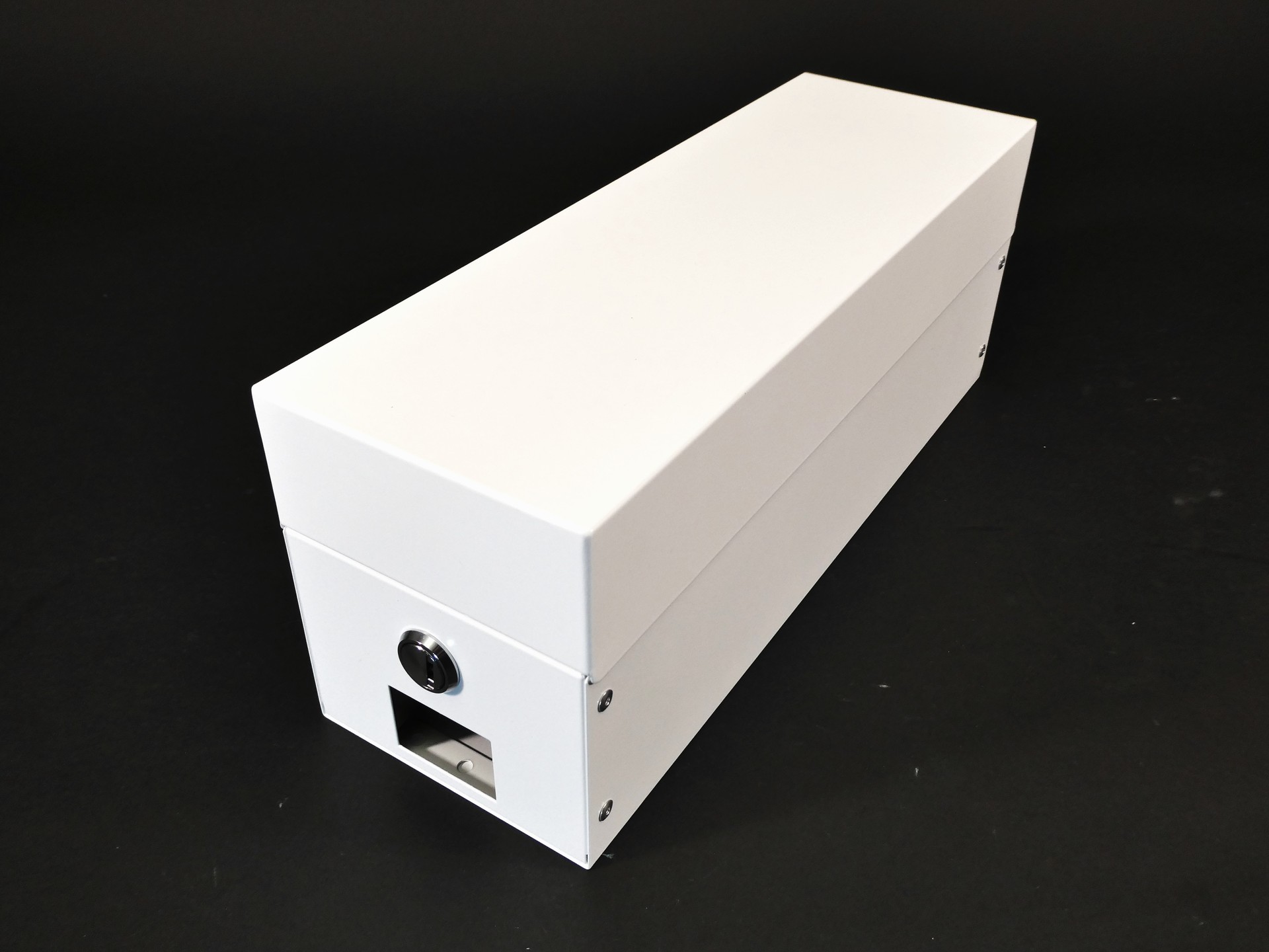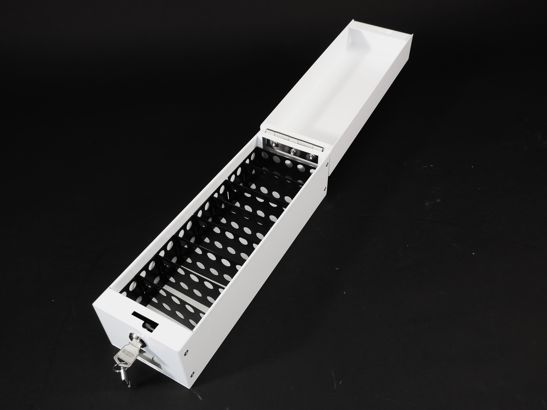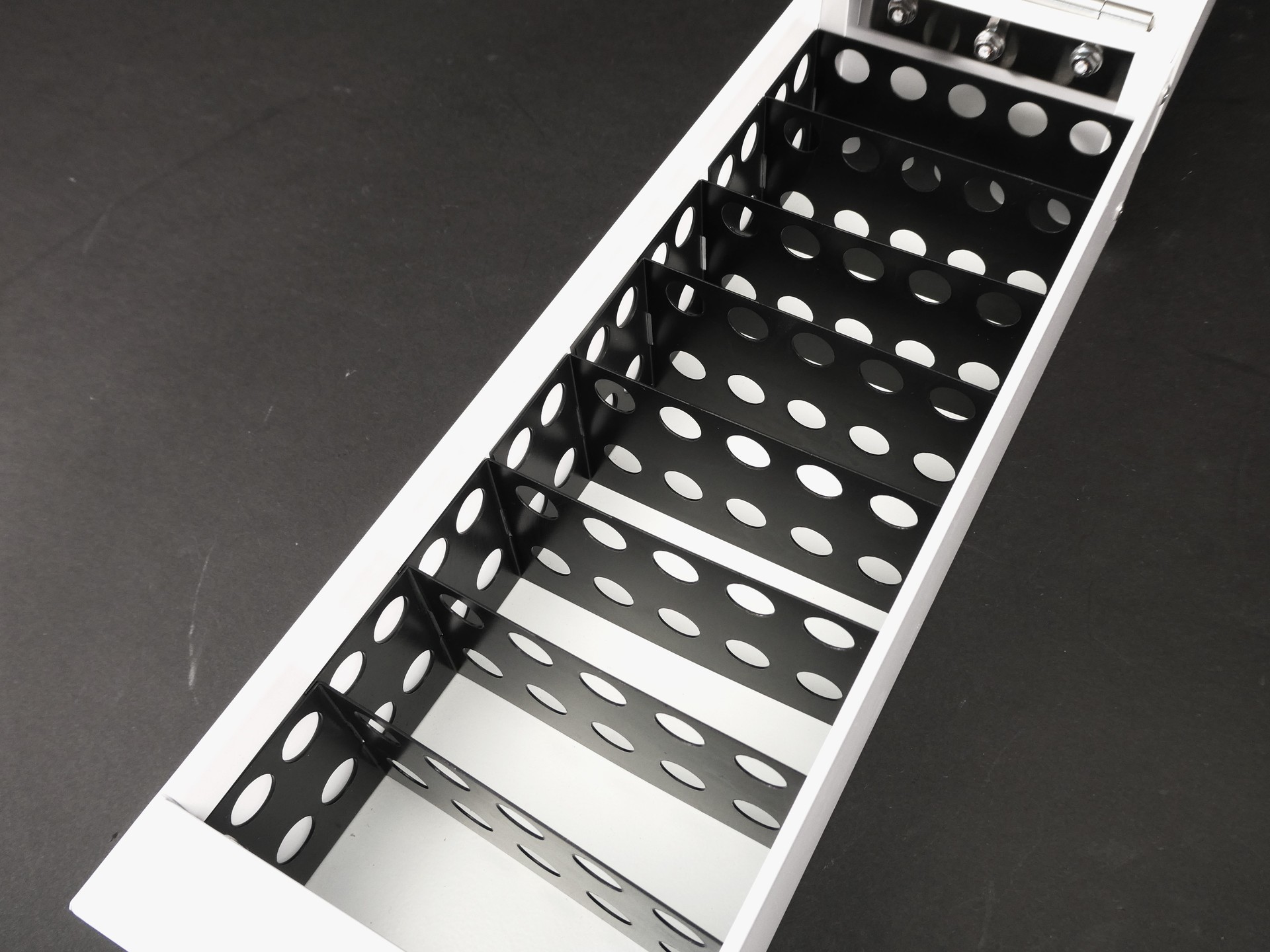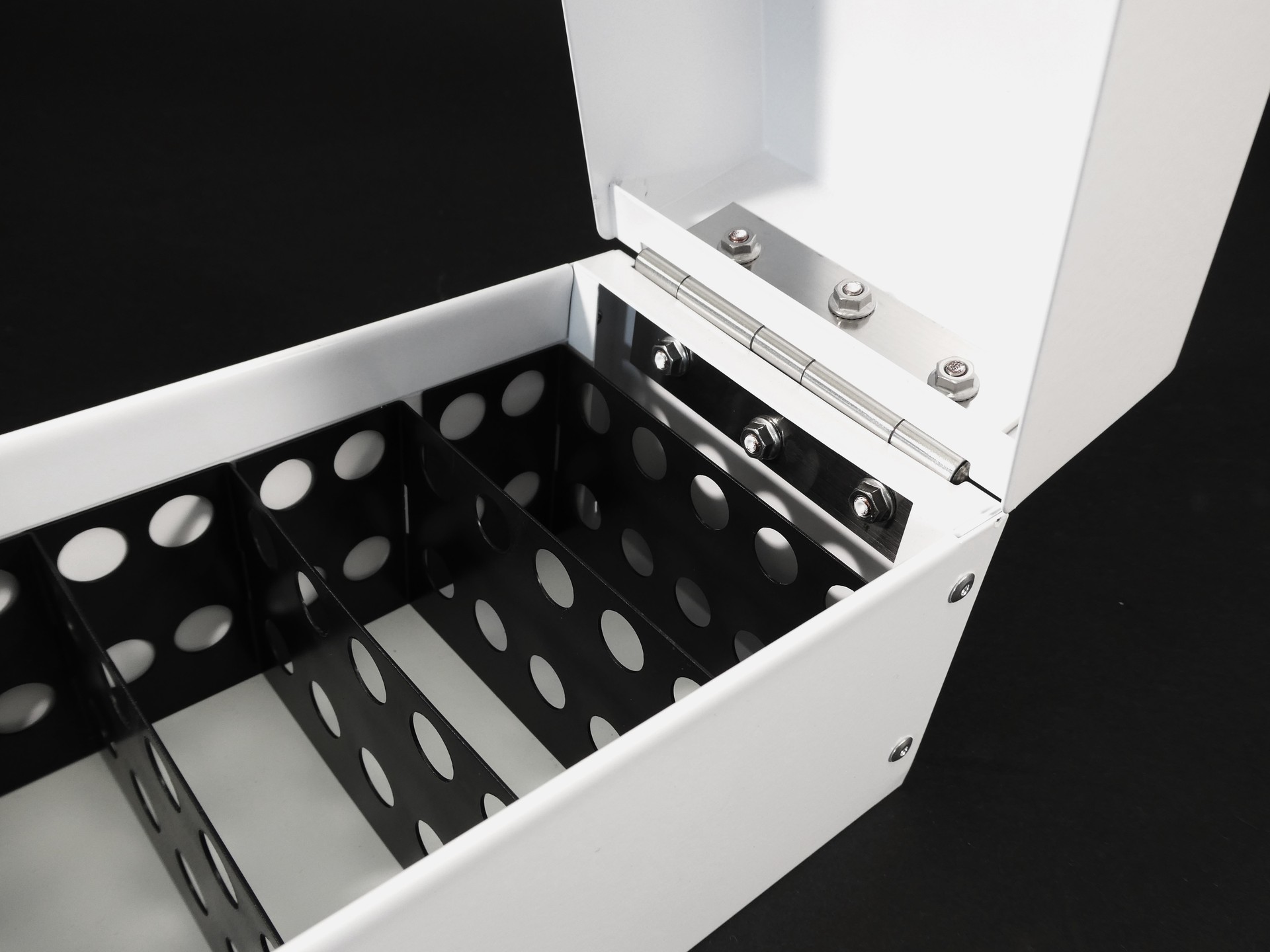 ②仕切り板は板厚をt1.0→t0.8に変更。更に多少なりとも軽量化を図る為、丸穴を複数個あけた。塗装ではなく黒色クロメートメッキ処理でコスト低減したが、意外にもボックス内部に組込すると、デザインセンスが良いとエンドユーザから評価を受けた。
