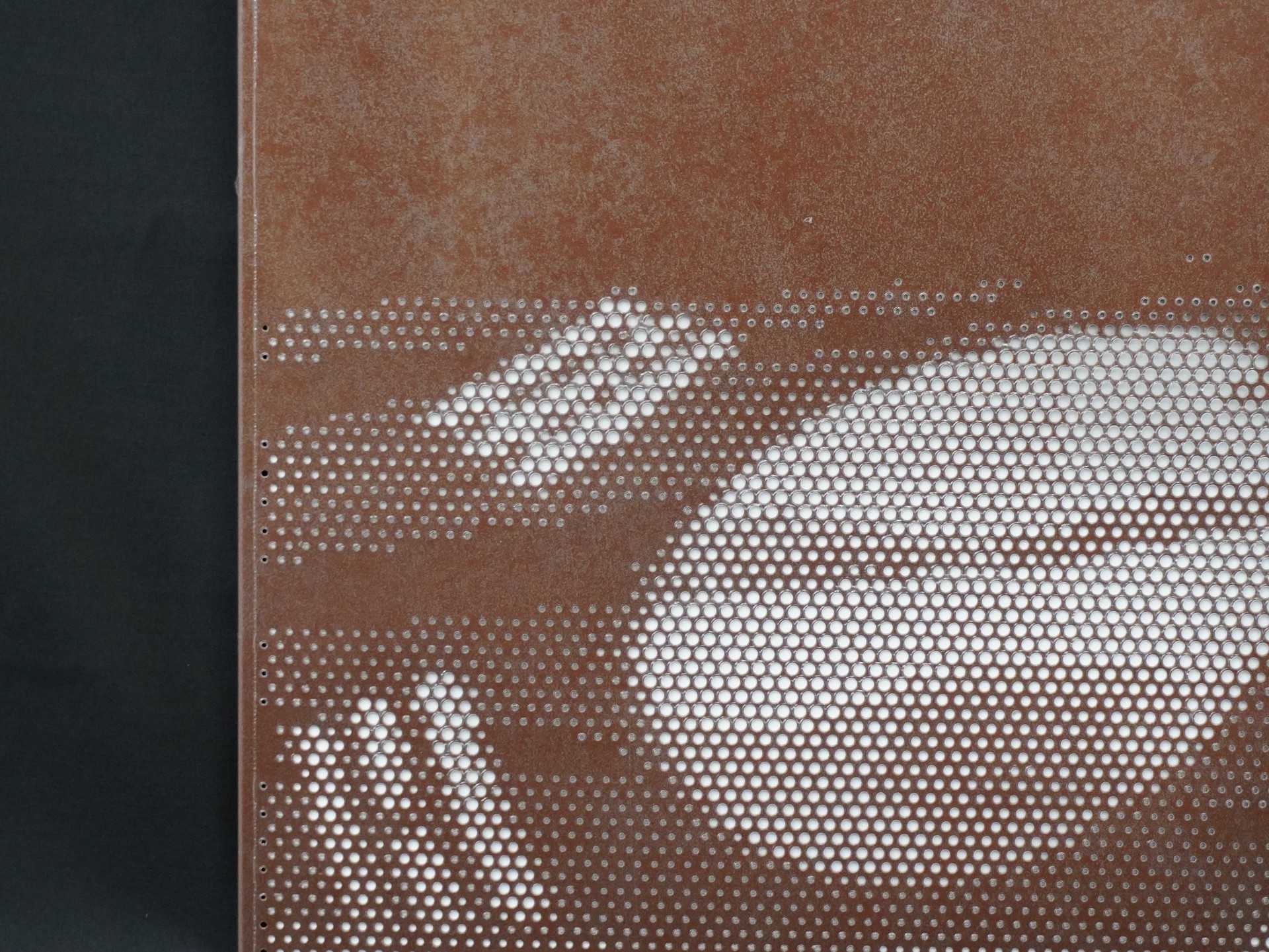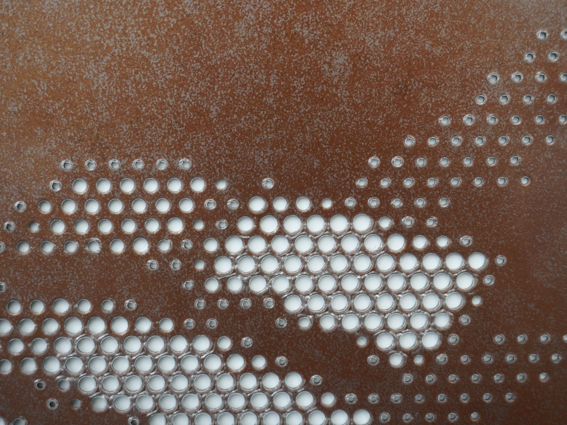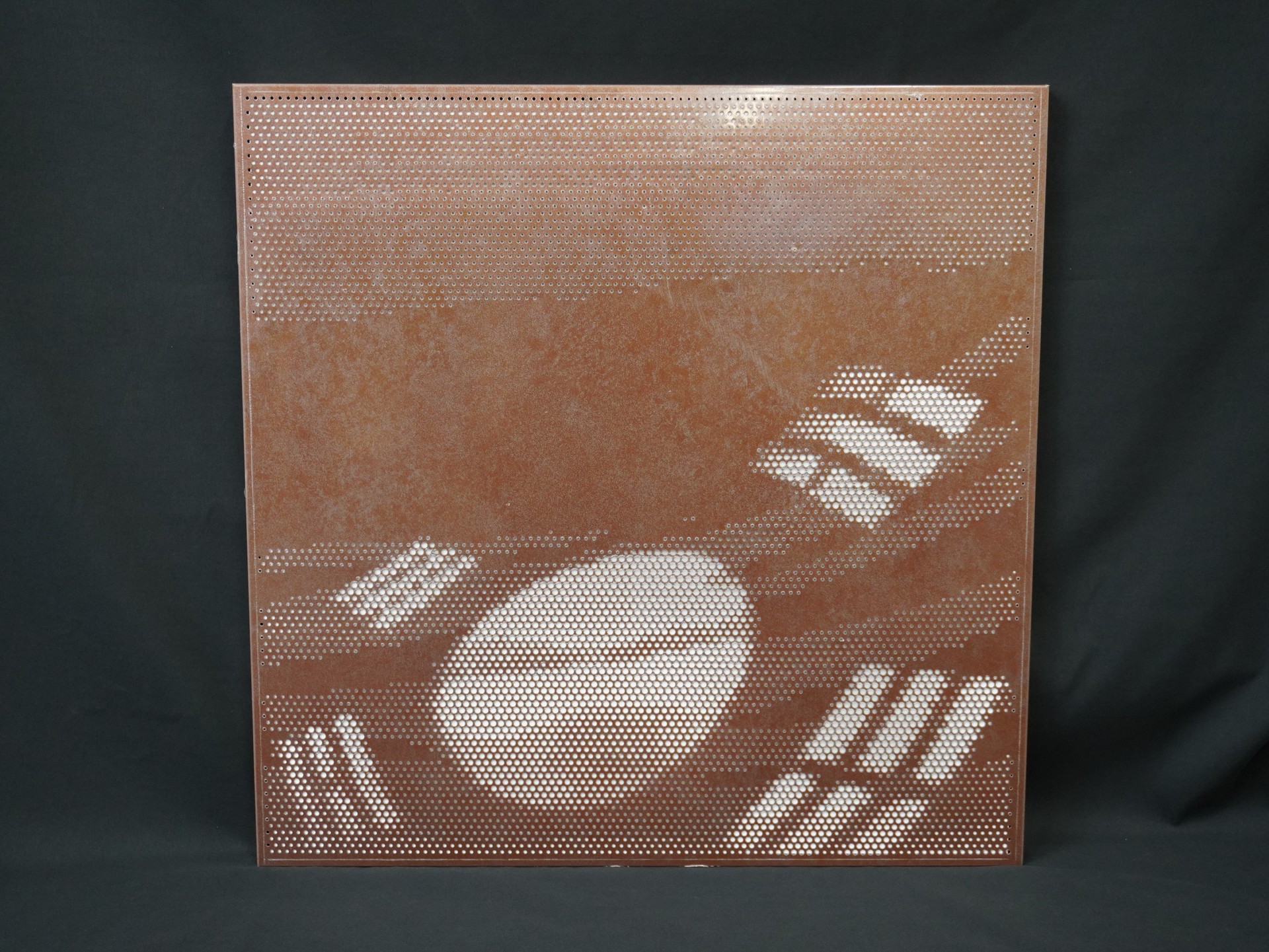 Taegeukgi : Korean flagのイメージを穴あけで加工した作品です。最も小さいピクセルは、Φ2(SIMPLE LINE様が保有している最も小さいPunch size)に設定し、様々なサイズのRO金型を使用して加工した。 製品のサイズが大きければ大きいほどイメージが鮮明に見えますが、板金フェアの作品サイズが600mm*600mmに限定され、イメージをより詳細に表現できませんでした。 スクラップ上昇防止のため低速打抜き加工で製品を完成しました。
