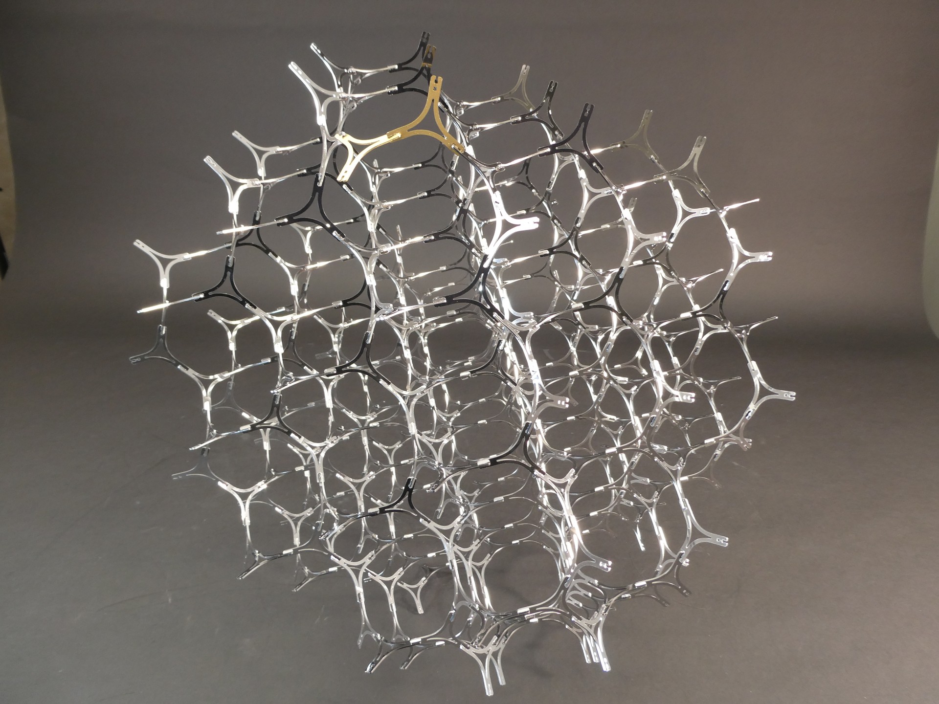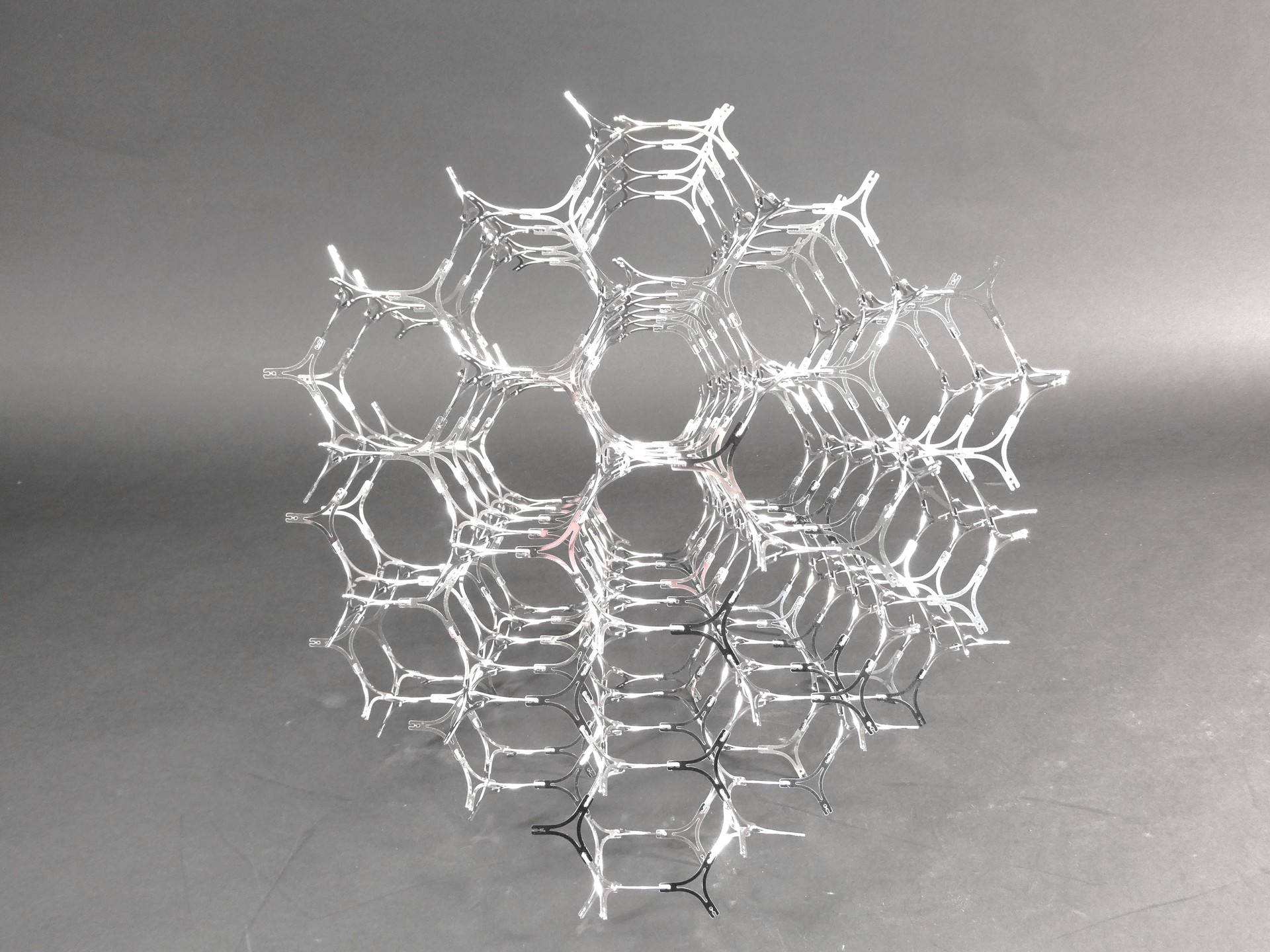 パーツは単一種類の三叉ユニットで、差し合わせた後に同一方向へ捻り、ArcCos(1/3) ≈ 70.529° の位置で固定する高度な組立手法を採用しています。