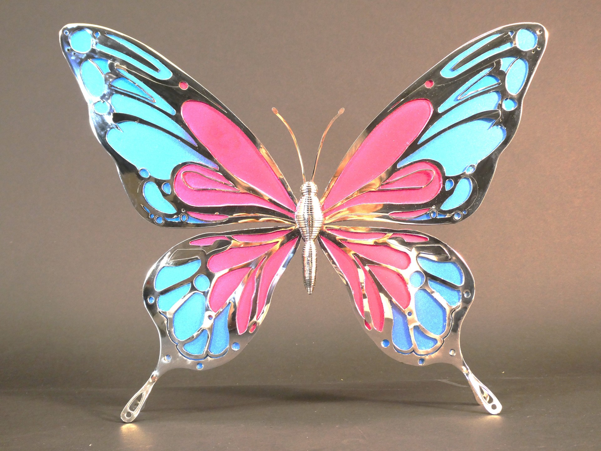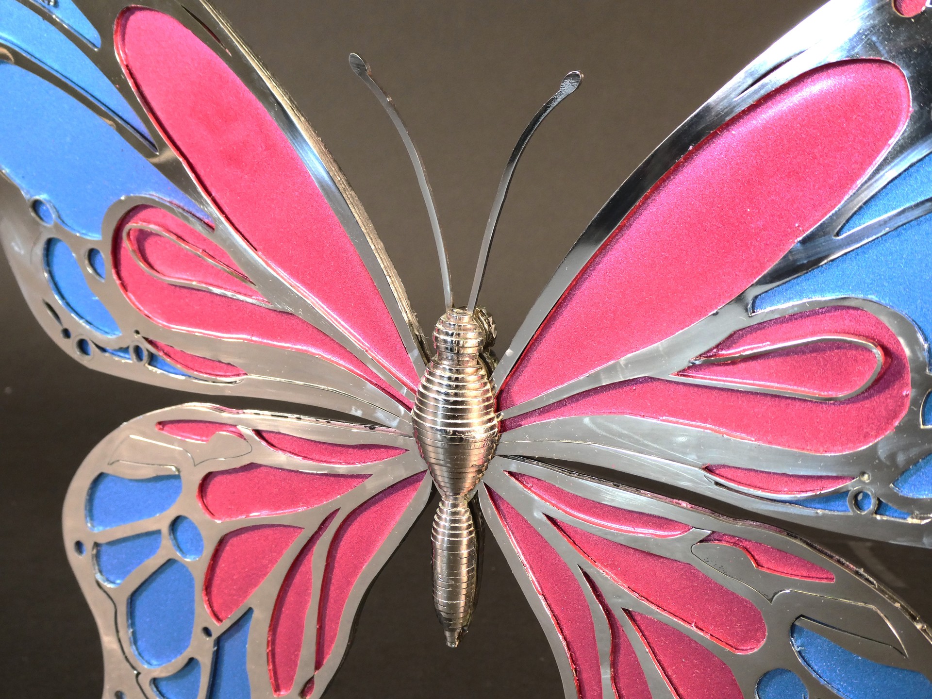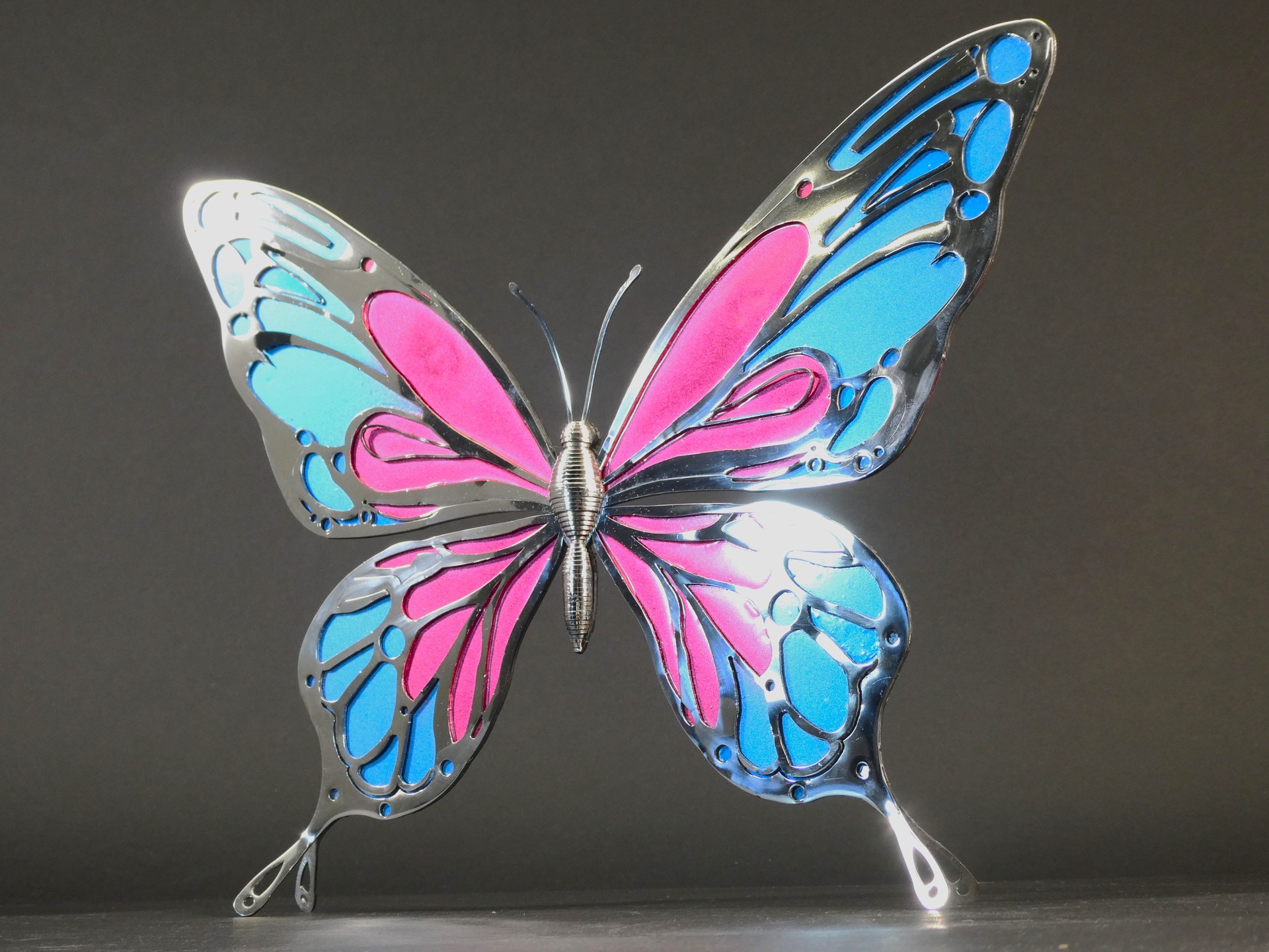 板金加工や構造を工夫して、色鮮やかに輝く蝶々を表現しております。設計とブランクを工夫し、美しい微細模様の翅を表現。胴体は穴を開けた板を積層構造でTIG溶接し、表面に溶接跡が見えないようにしました。表面磨き時、抜き加工で微細ジョイントを残すなど工夫し、磨きやすくしました。1.5t-0.5t-1.5tの板を組立後、外周に2㎜のジョイントを付けて焼けが塗装面へ影響しないようTIG溶接。0.5t板は切欠き加工で隙間なく溶接。蝶々の枠ピースは表裏で塗り分け、彩りを再現。安定して直立するよう構造を工夫し、下翅の曲げを左右対称に調整しました。また、図面に関しては、CADで細部まで描き、イメージ写真と組み合わせました。磨きについては、抜き加工でジョイントを残し、エッジの引っ掛かりを防ぎつつバラしやすくなるよう配慮しました。