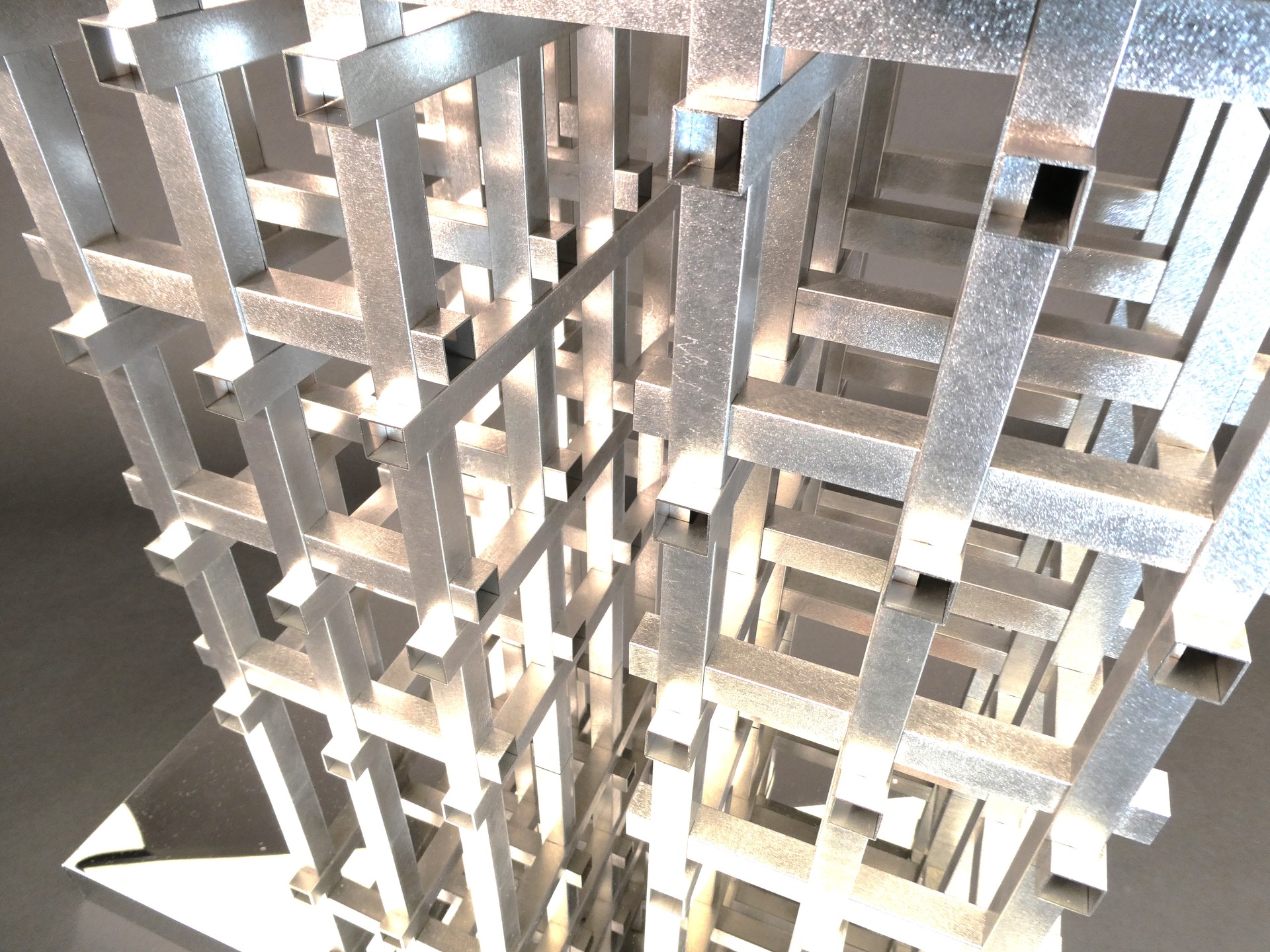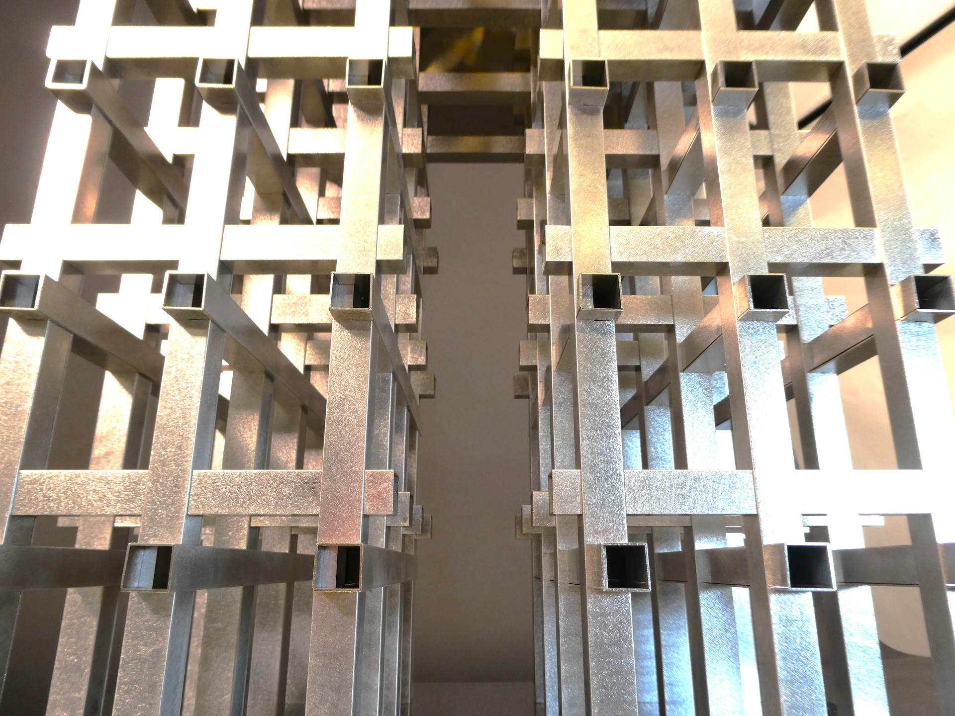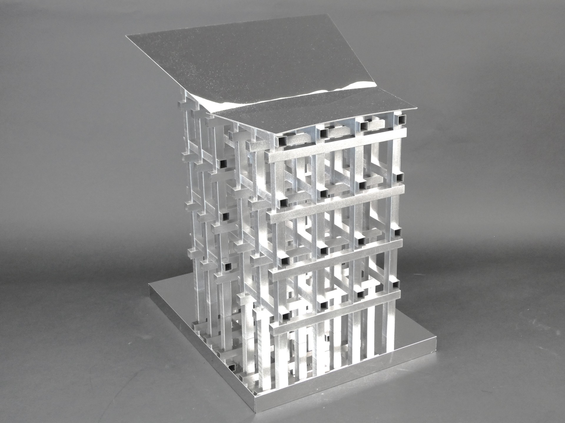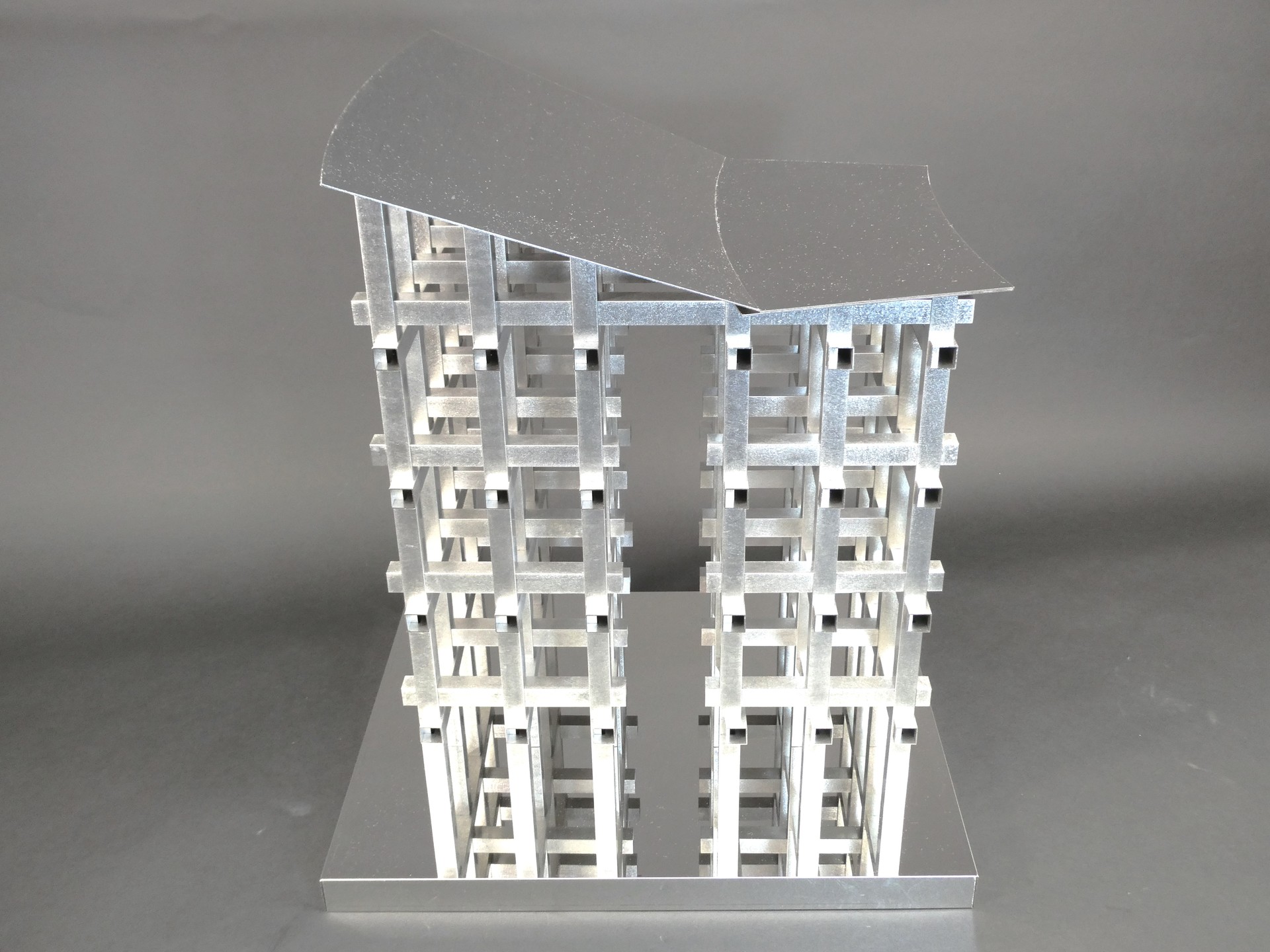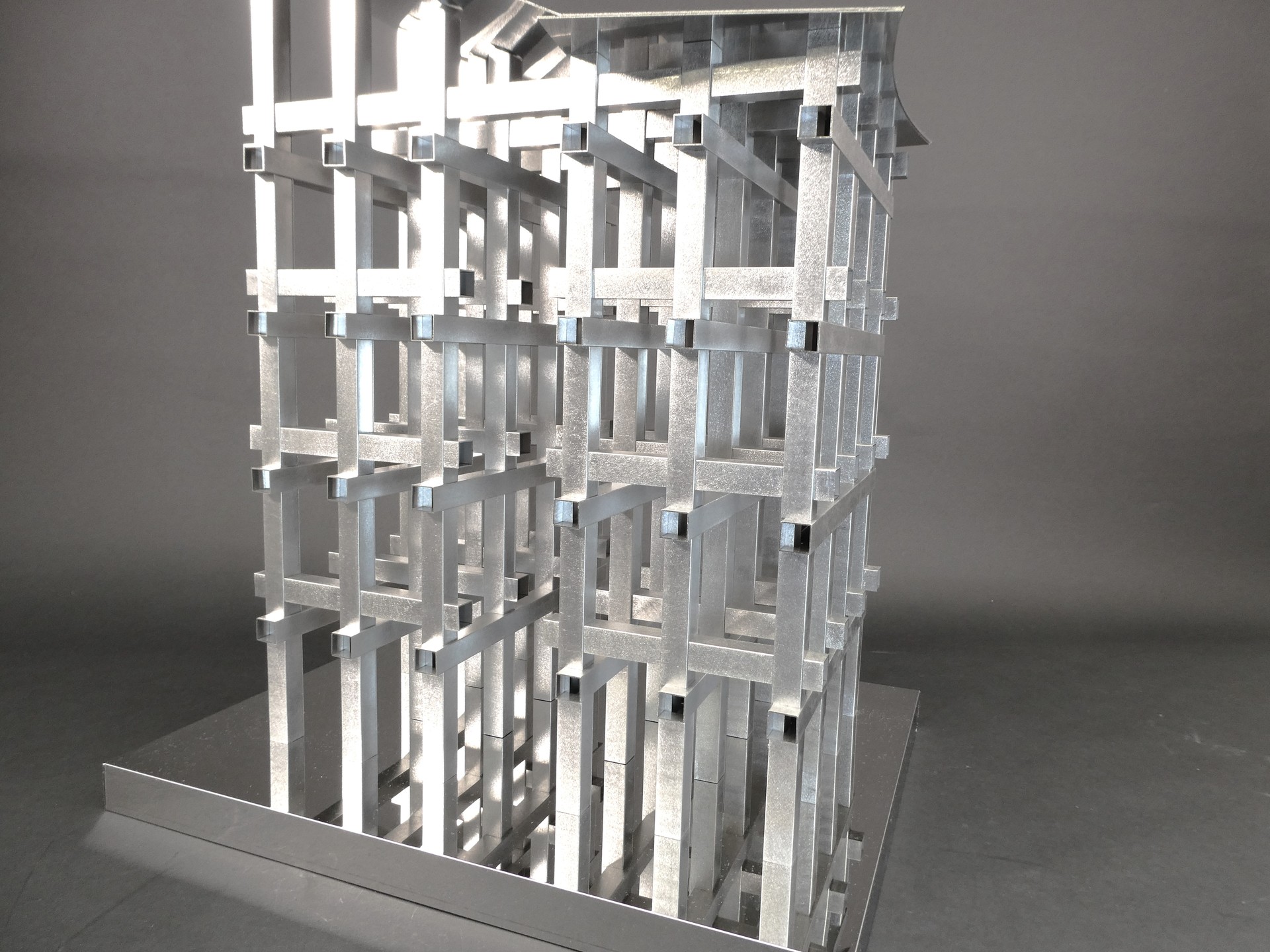組み立て時に歪みがあると全体の噛み合わせに支障が生じるため、すべての部品を高精度で仕上げ、誤差のない構造を実現しました。ステンレス特有の素材美と加工の難しさは、作品の完成度を左右する重要な要素です。そのため、一枚一枚の板材を丁寧に曲げて組み上げることで、溶接を用いることなく再分解可能な構造を実現しています。