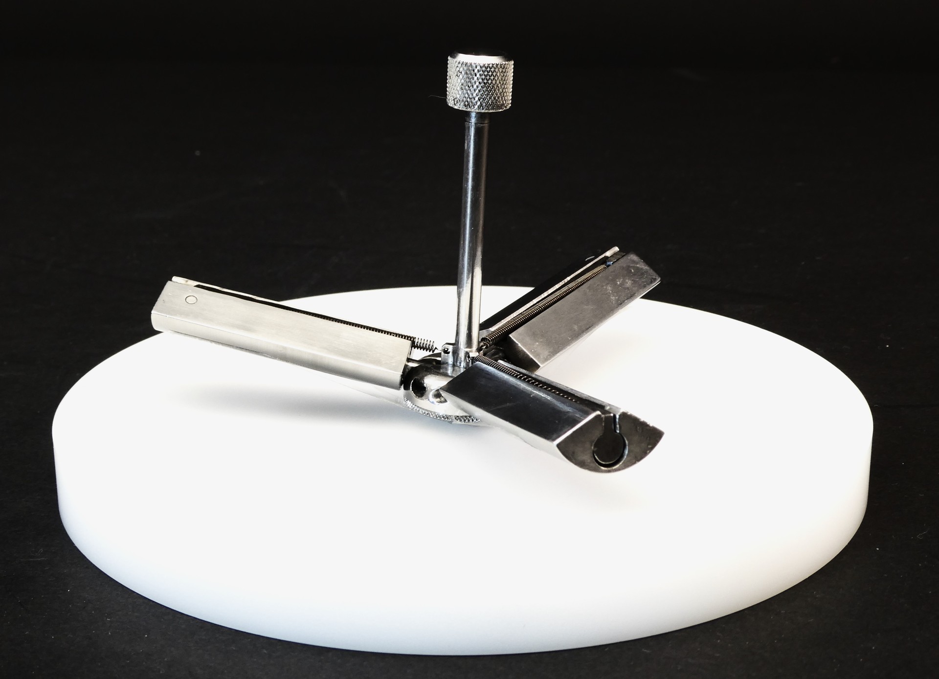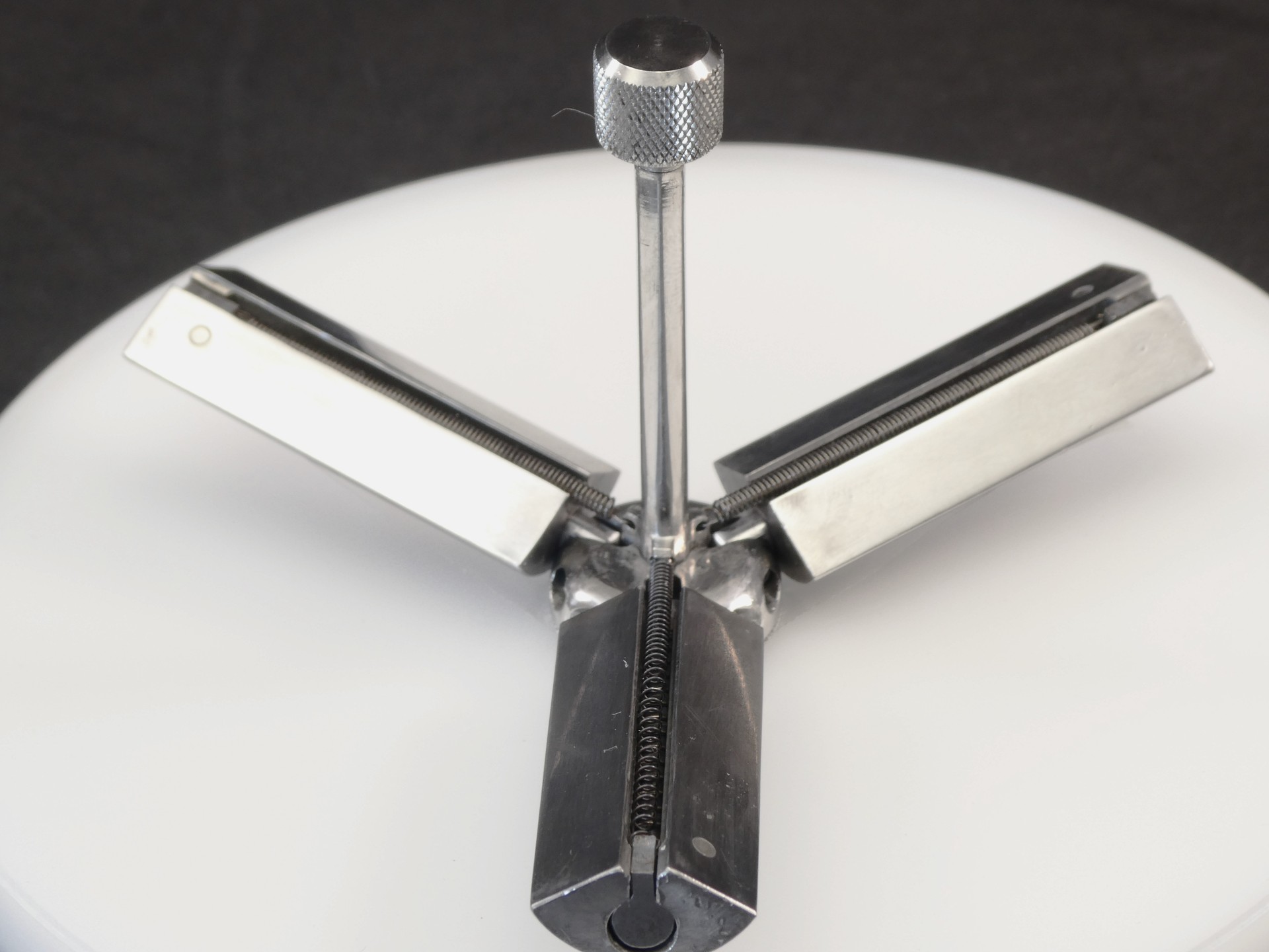 回転させるとアームと羽がスライドして、遠心力で羽が開き、回転が弱まると羽が戻りφ20の元の状態に納まる緻密な仕掛けです。