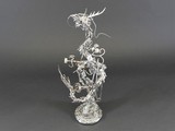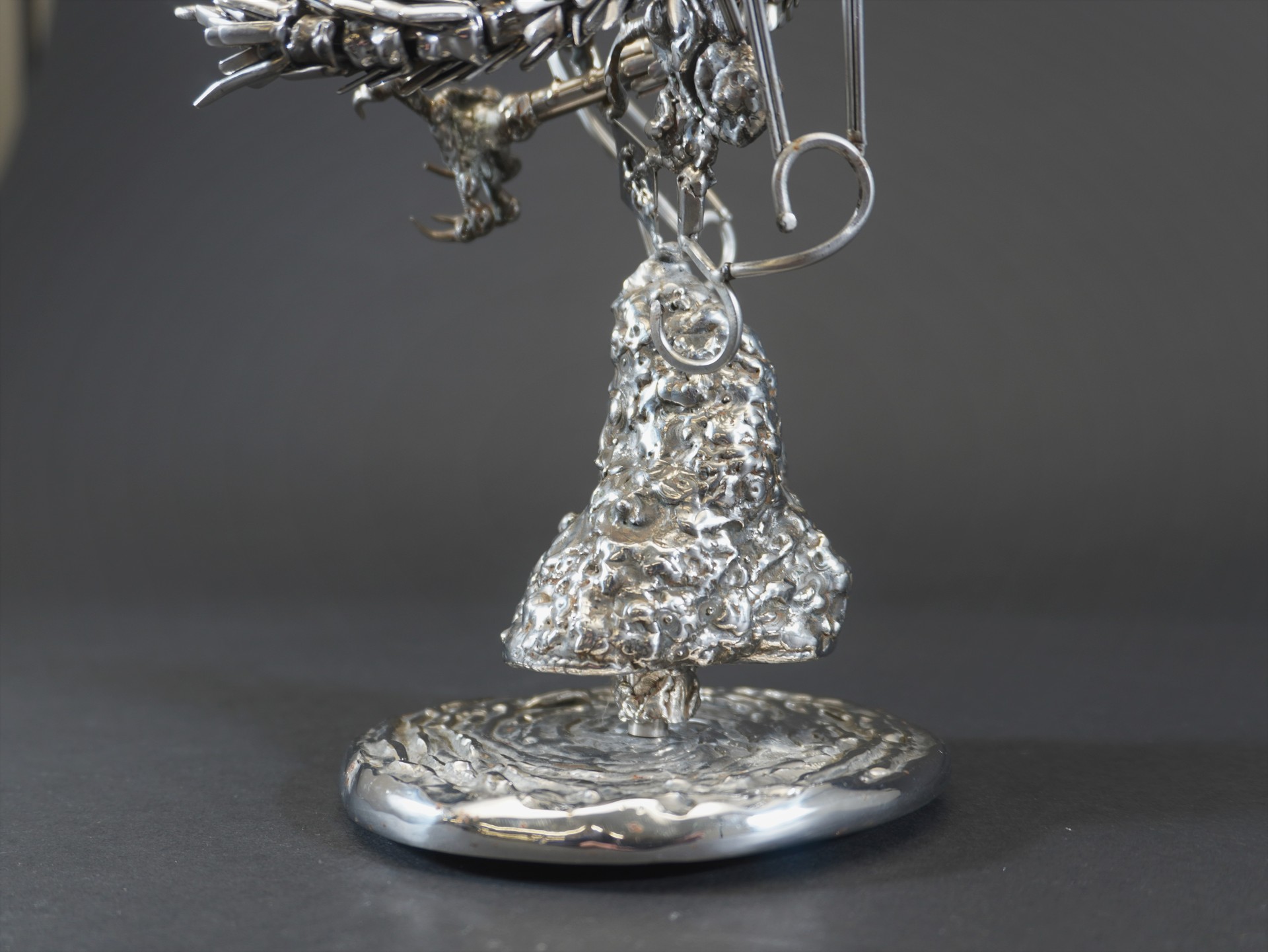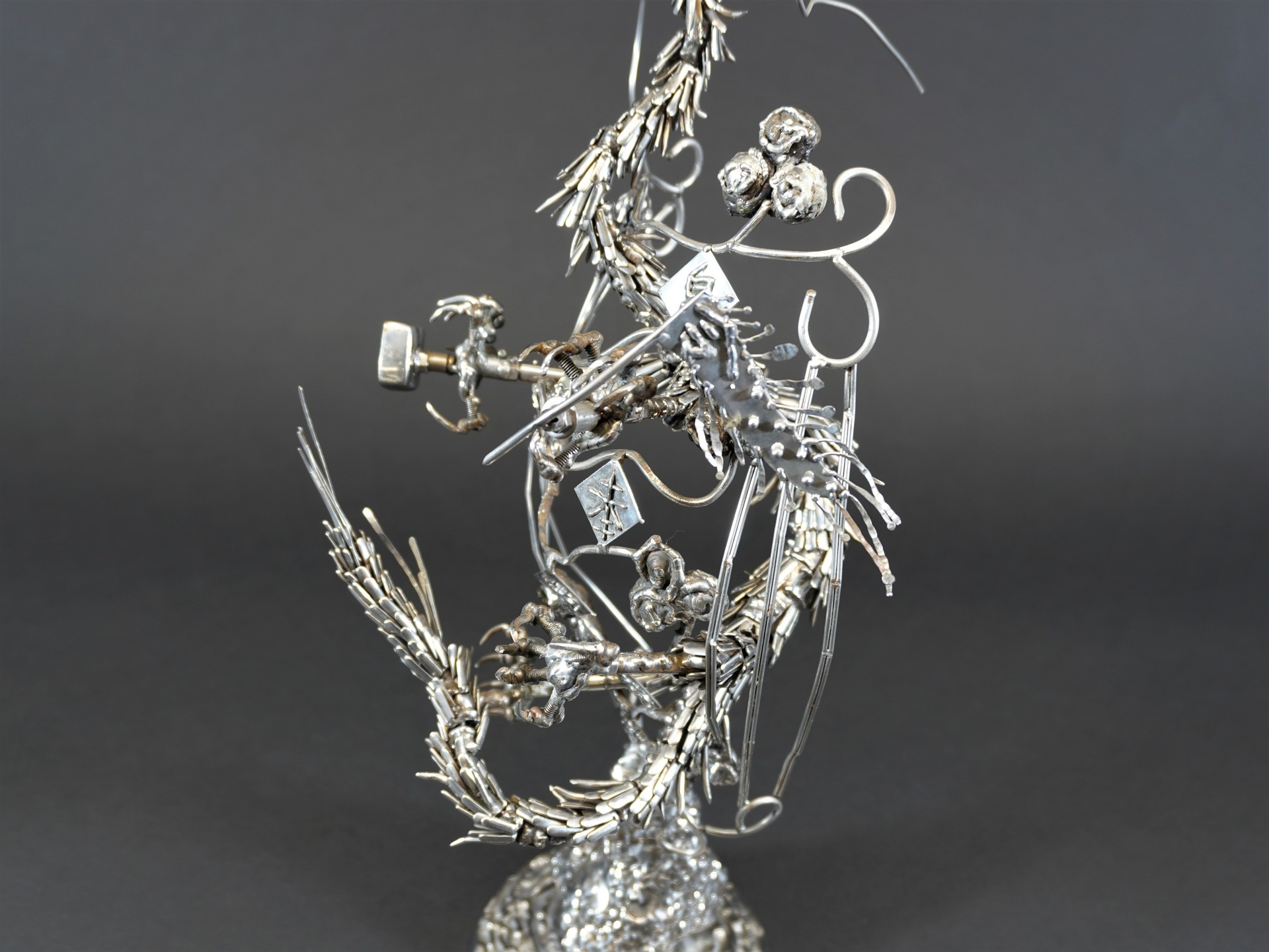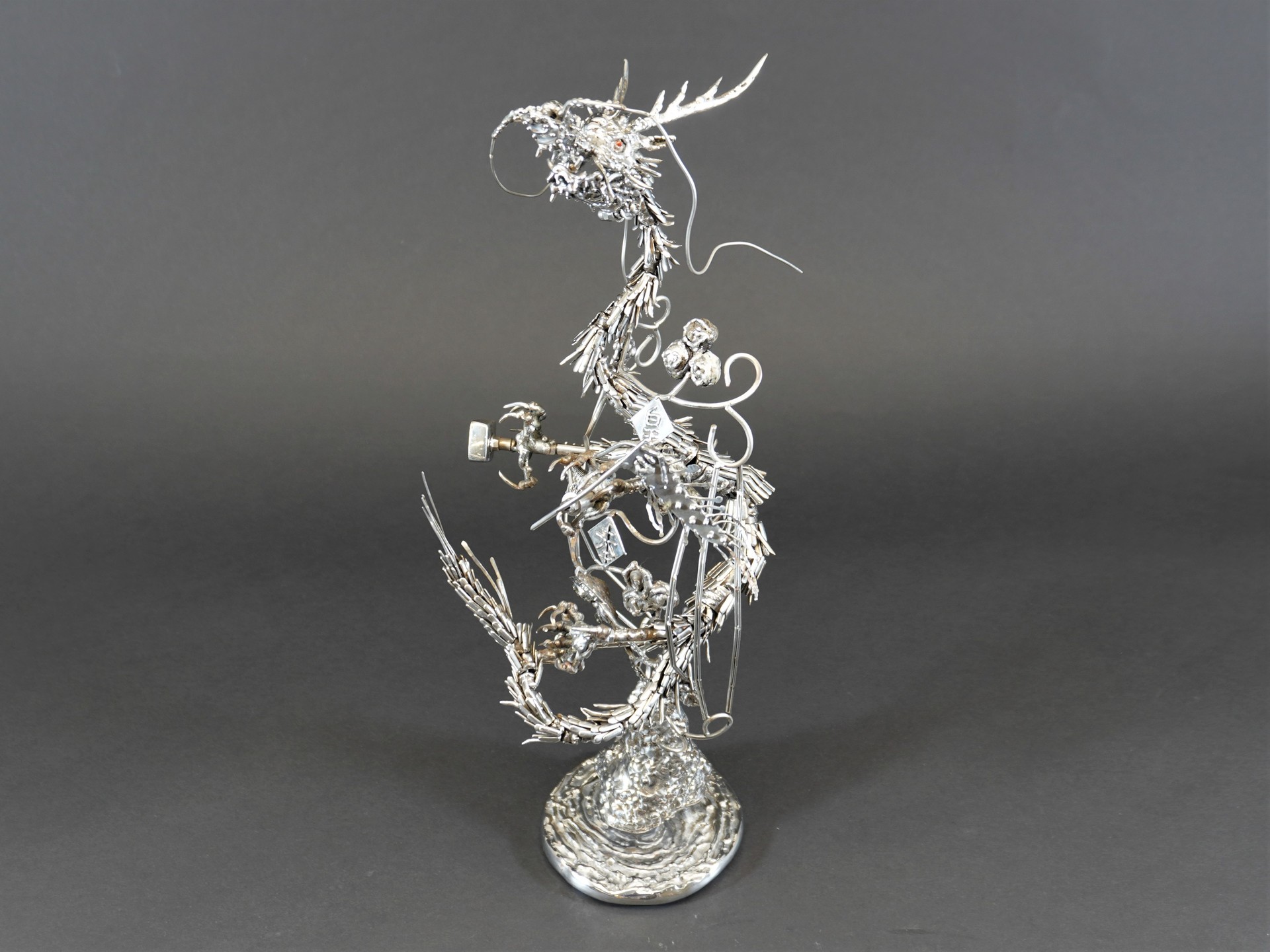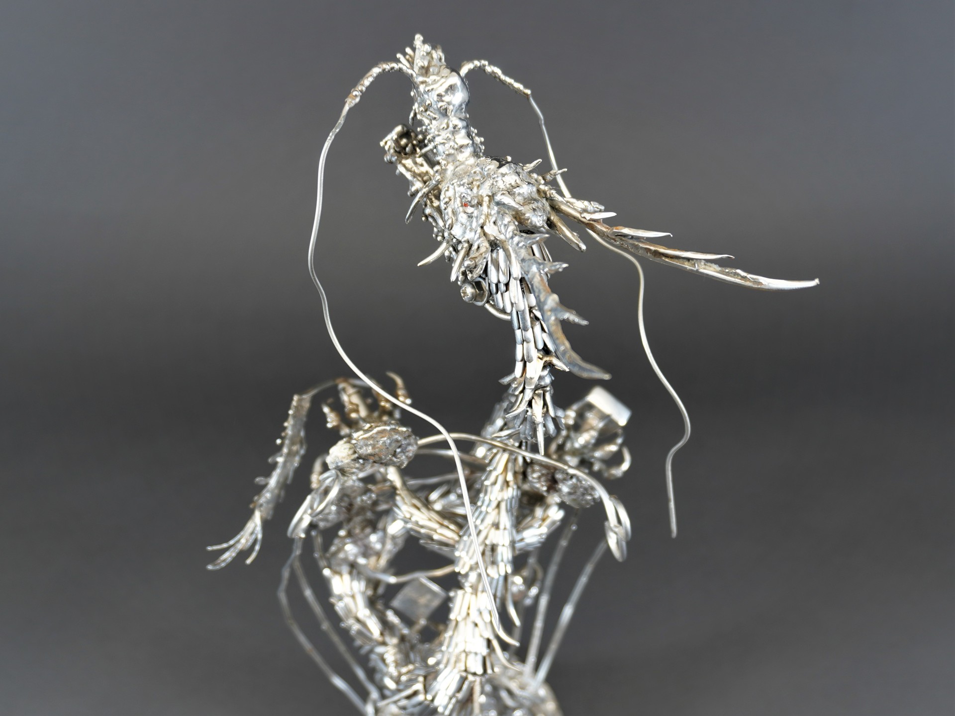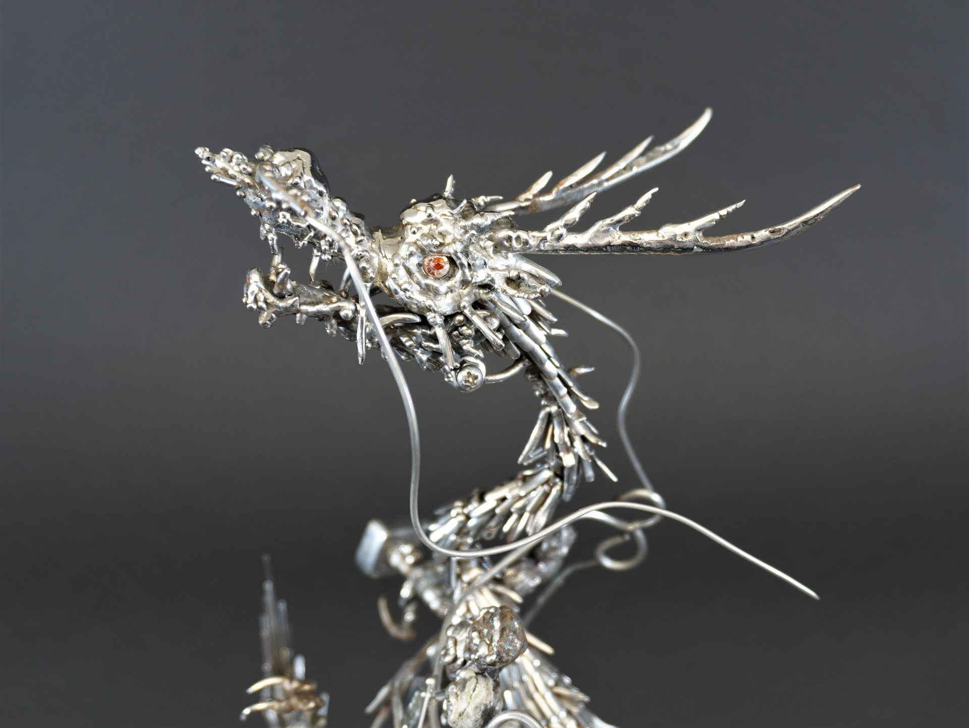 The dragon’s head is crafted using a combination of semi-manual and mechanical techniques. First, the upper and lower parts of the head are bent using a press brake, then entirely hand-welded to form the dragon’s head. The dragon’s body is composed by joining together sections of small tubes, while the scales are made from long oval pieces (5x2) processed with NCT. A total of 950 scales are individually welded together to complete the form.