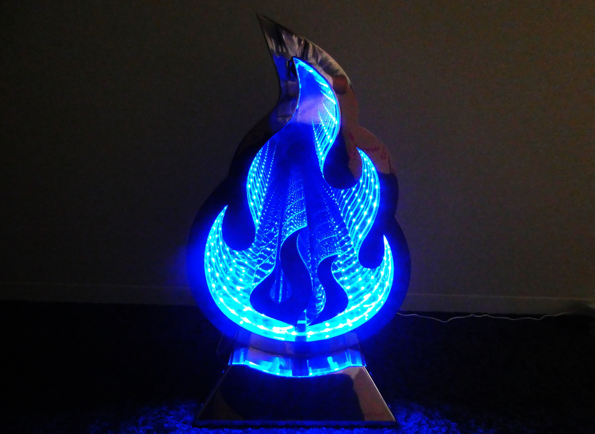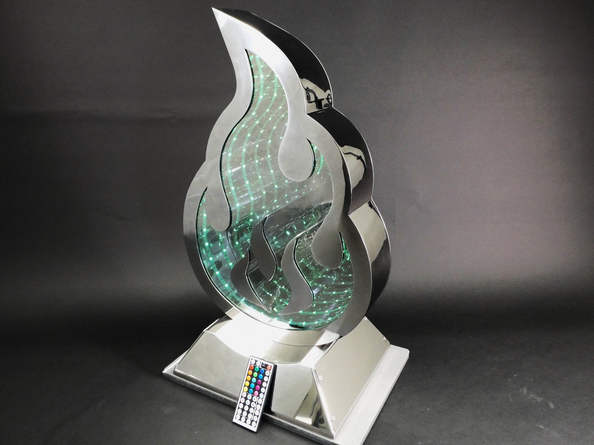 炎をモチーフにした複雑な外殻と内殻の側面は板厚を1.5mmにし、FR曲げで柔軟な形状を作り、表面の2.0mmの板に歪みを最小限に抑え溶接し、同じく薄板で歪みの発生しやすい研磨工程も細心の注意を払い、粗目の番手から徐々に目を細かくして磨き上げています。