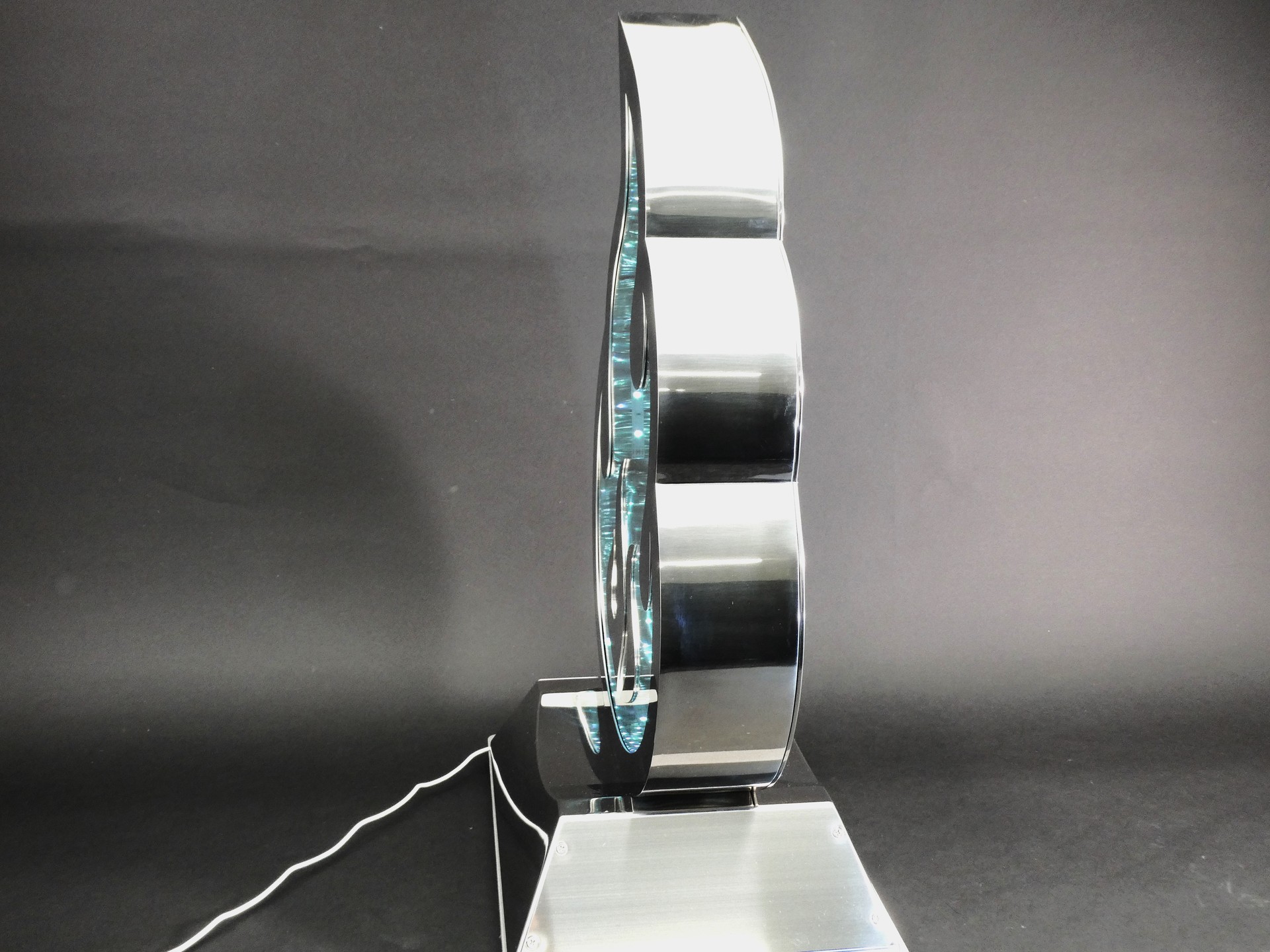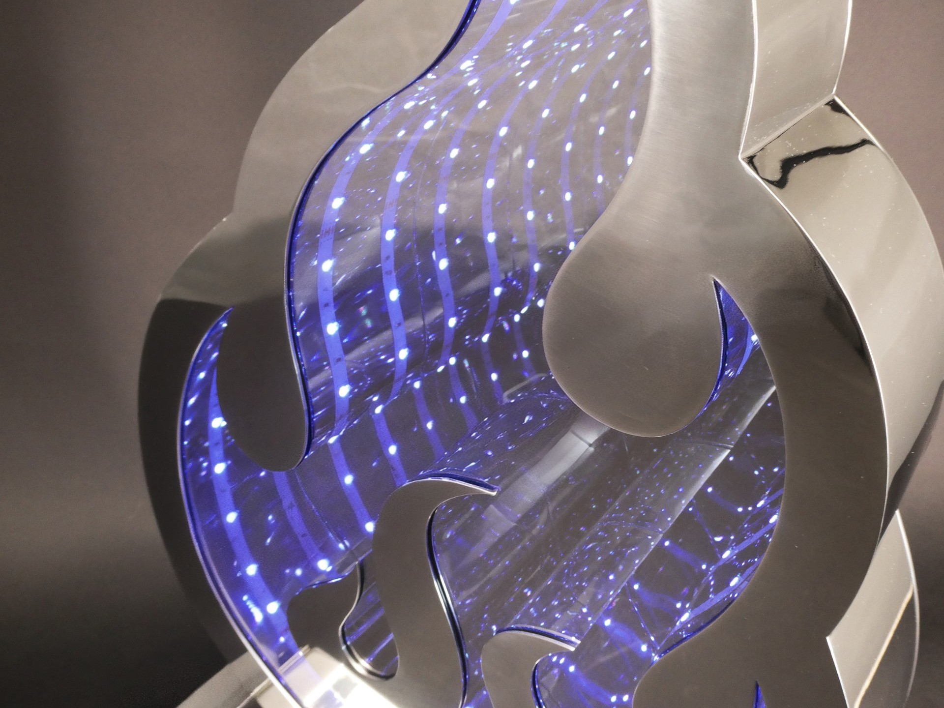 本作品では鏡の代わりに#800の鏡面のステンレスを使用し、その反射を利用することで、100mmという厚みのなかに無限の奥行きと幻想的な空間を表現しました。