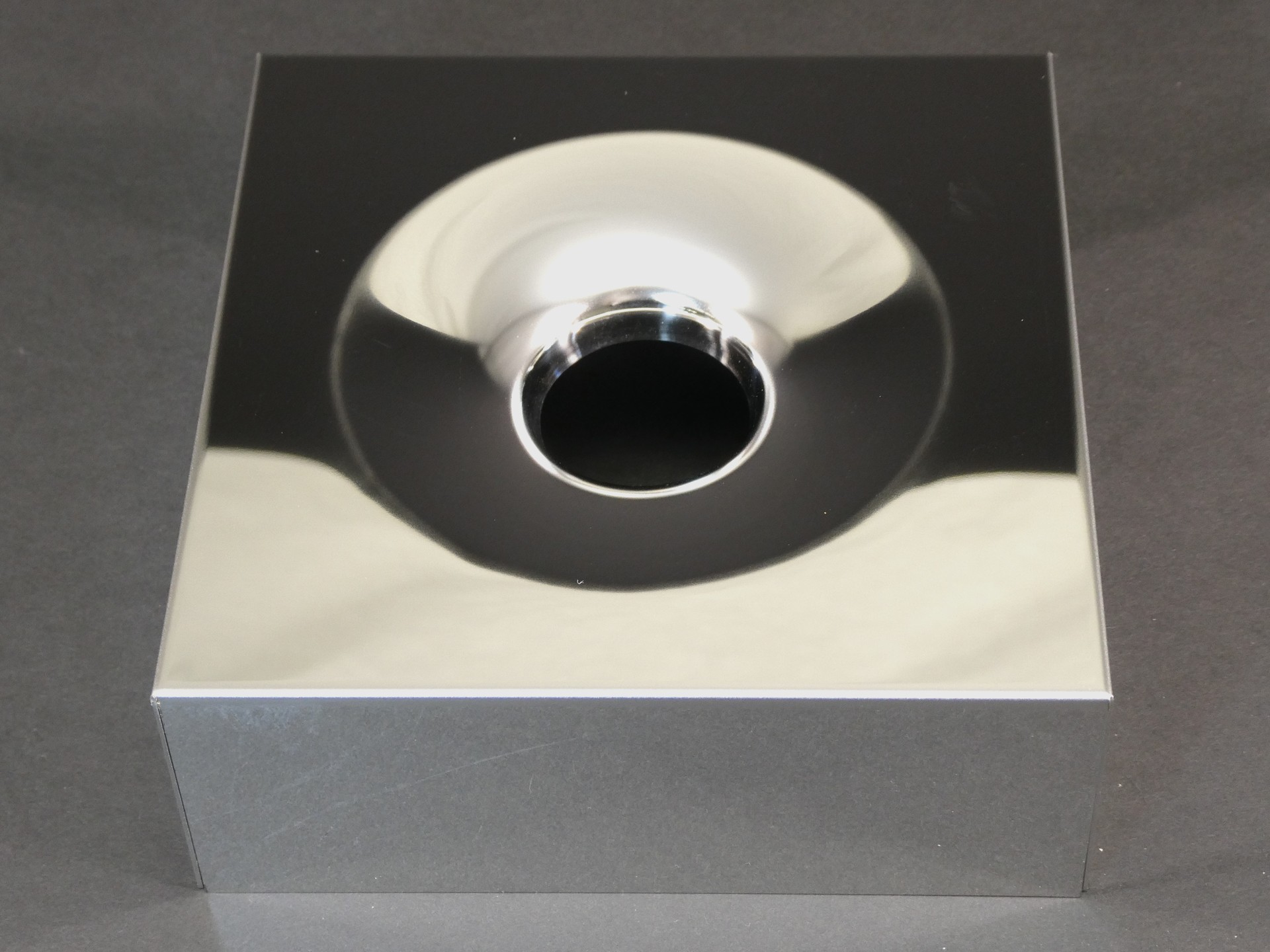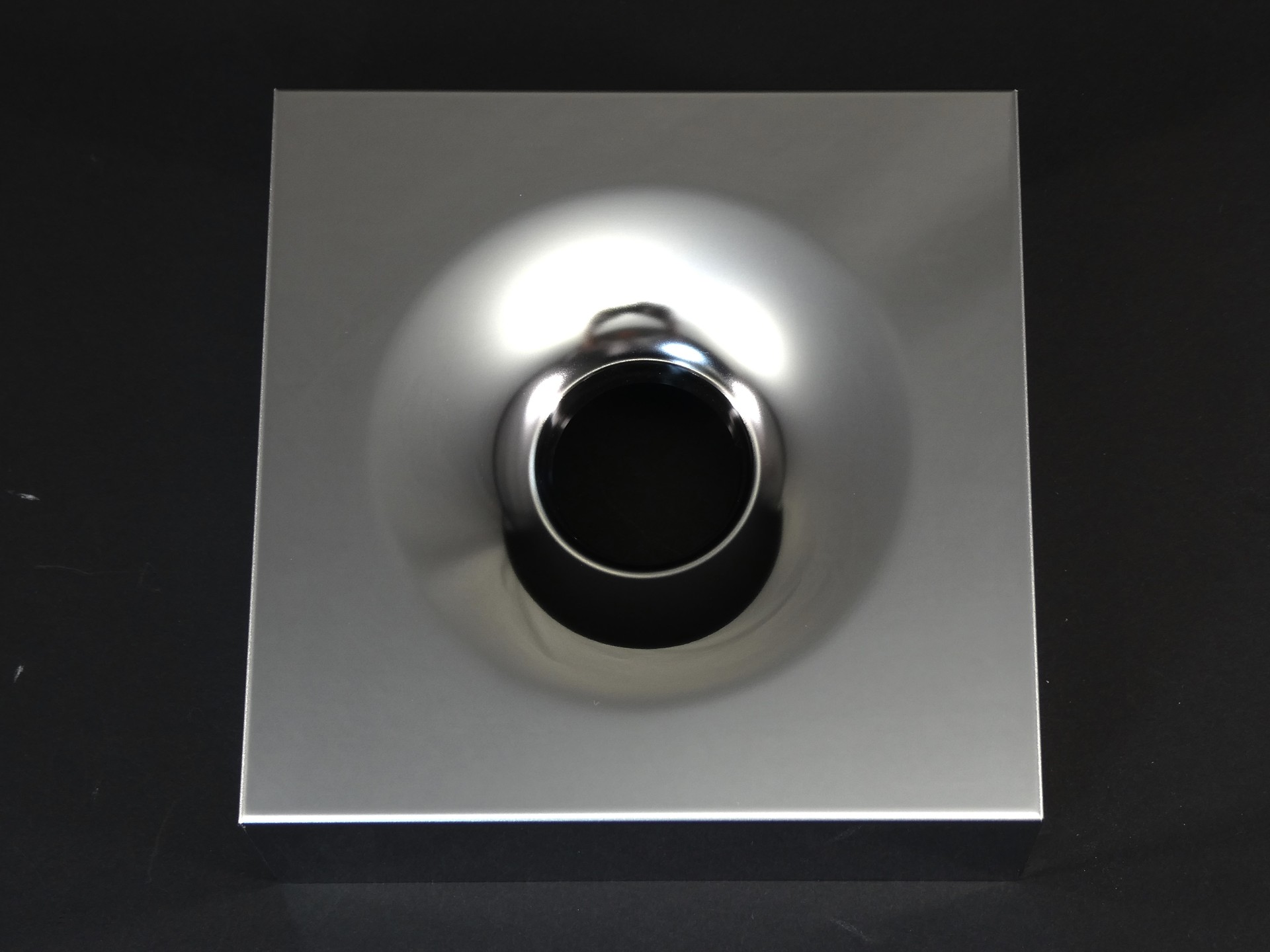 また、板を延ばして穴を広げる加工の性質上、穴の外にも応力が発生し、ひずみも強く出ます。しかしながら、そのひずみを抑える仕組みの工夫と、これまでに培った職人の技術力で、完成した作品については高い平面度と曲げ精度を実現。