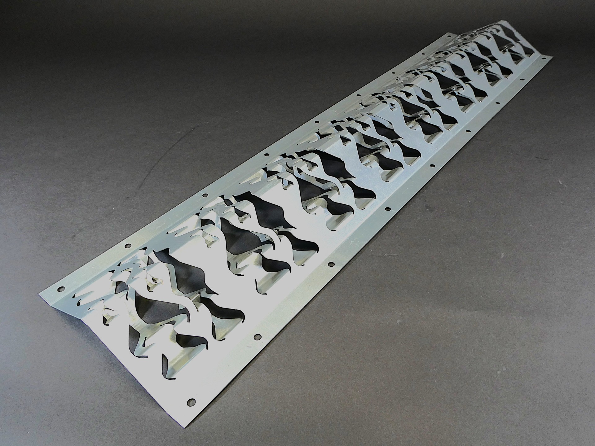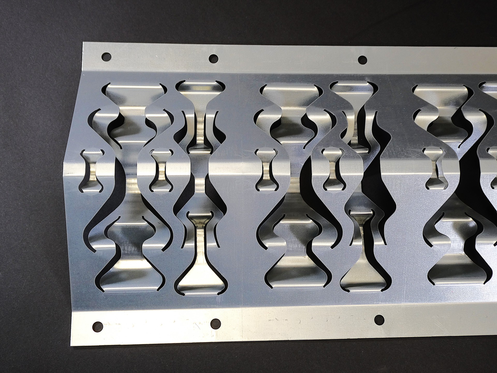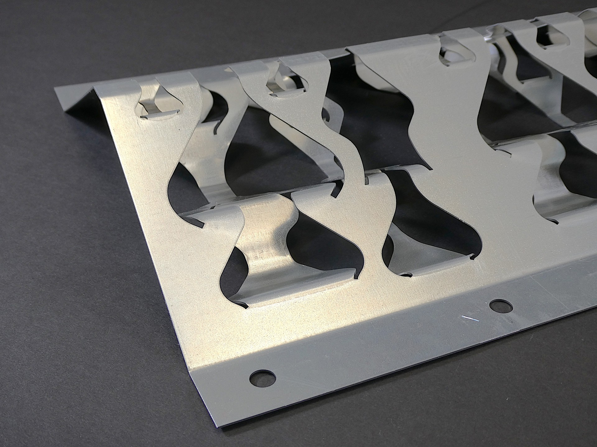 製品の両側で円弧のピッチが異なっており、順送でピアス曲げをする際に円弧のピッチを変えなければならないが、異なる長さを加工するには通常の金型では難しいところ、長さに応じてあけたい位置に穴をあける機構がついているので、両側でピッチが異なっていても複数の長さのモノを1つの金型で加工が可能となっている。