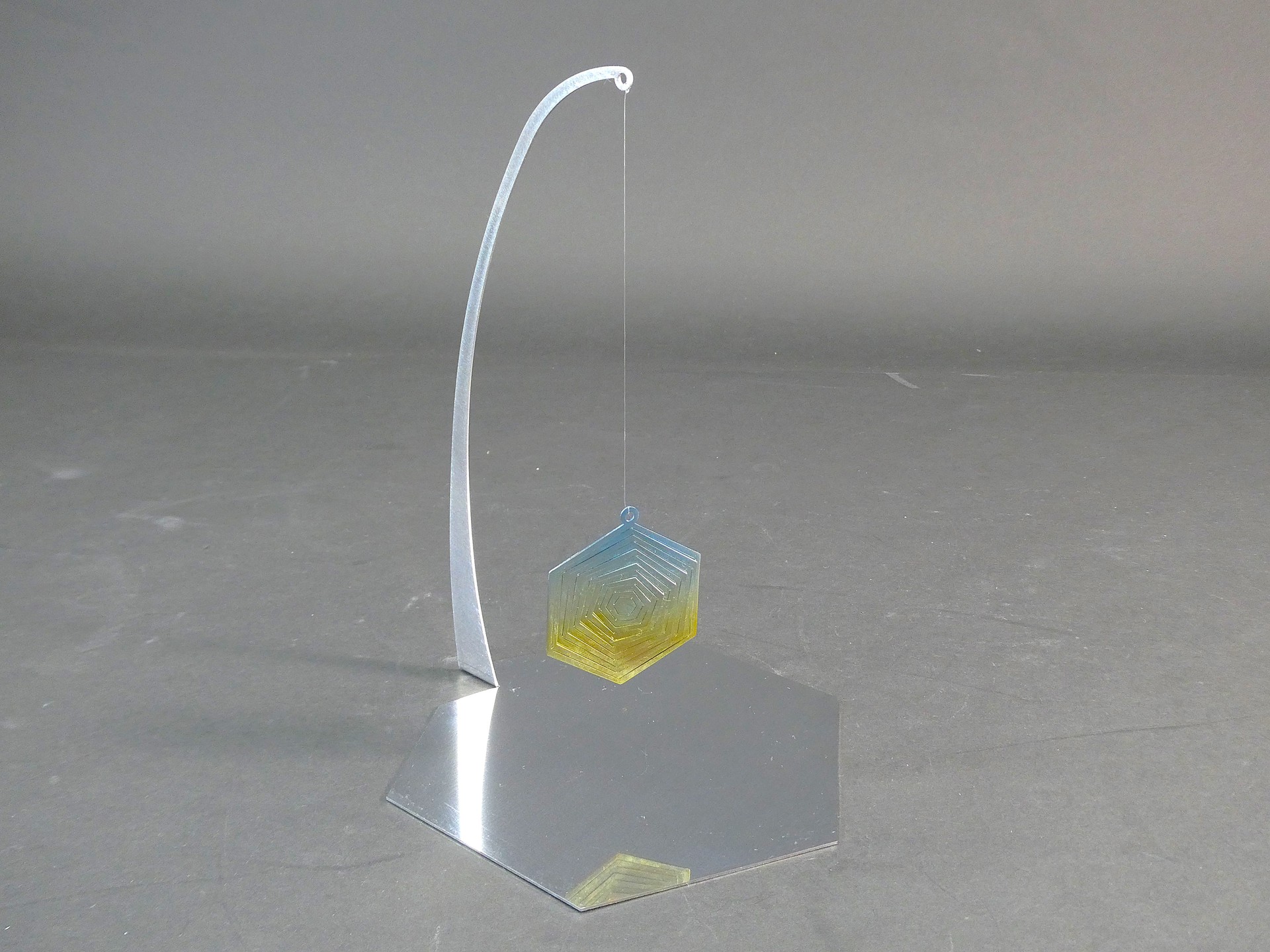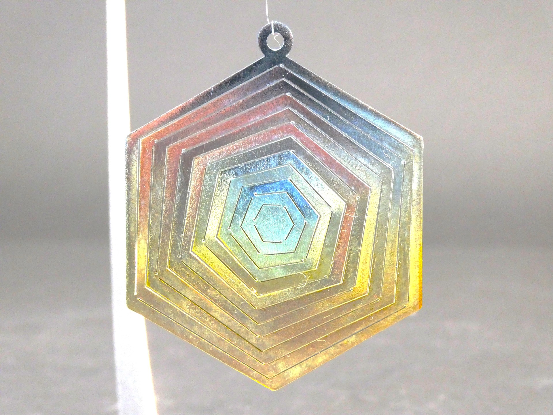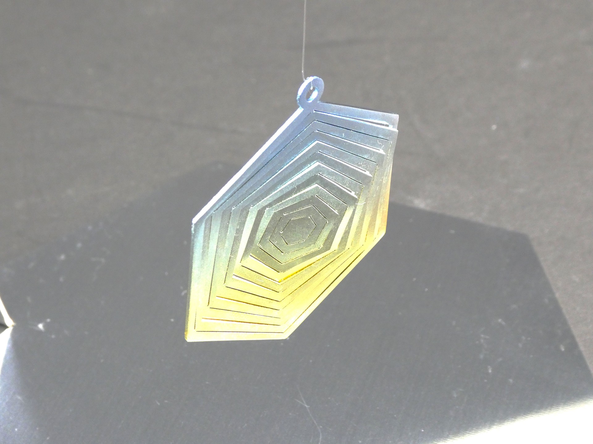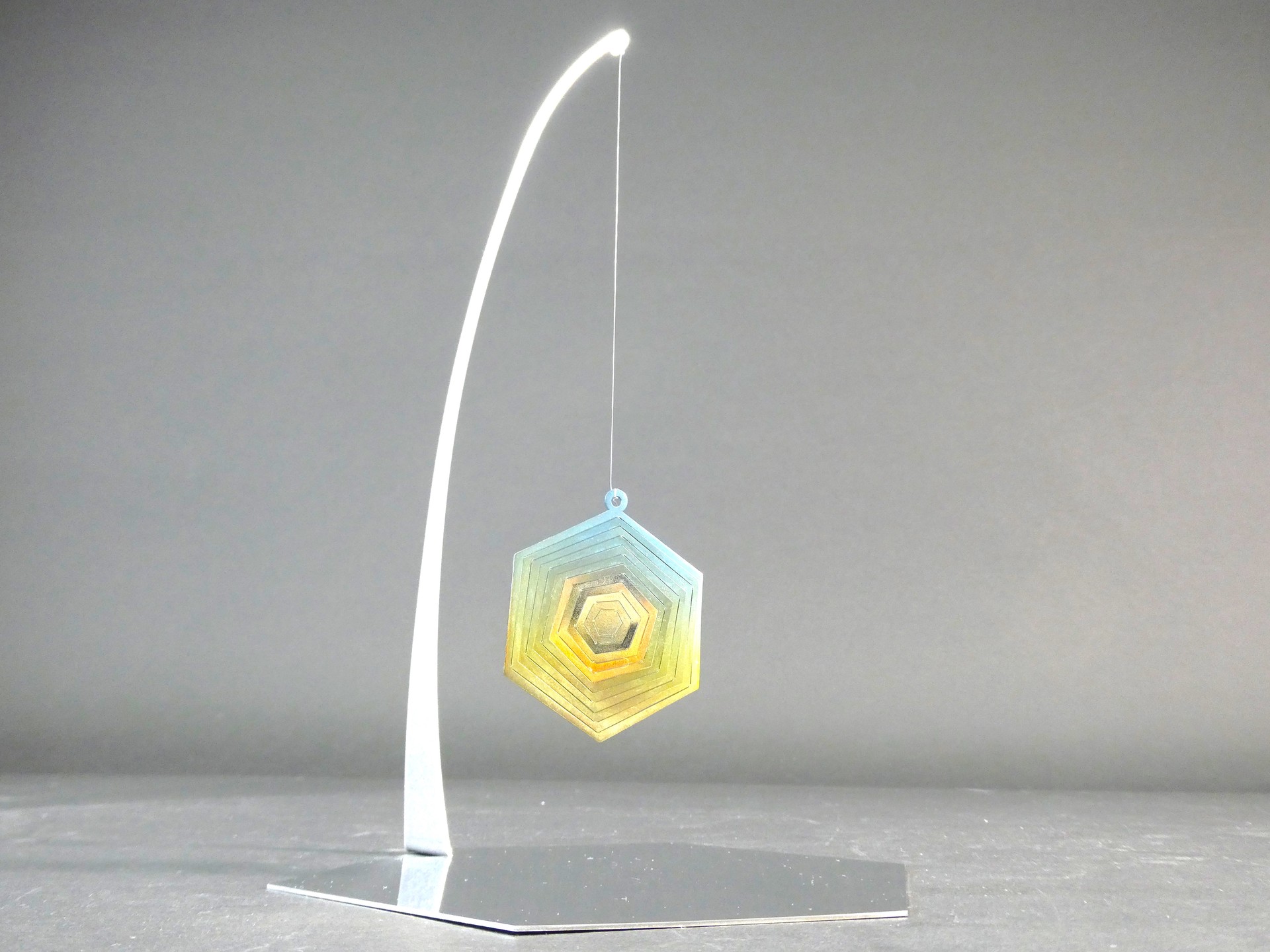 六角形を同心状に重ねることで、角度によって光の反射面が変化し、見る位置により色彩と輝きが移ろう構造を設計しました。