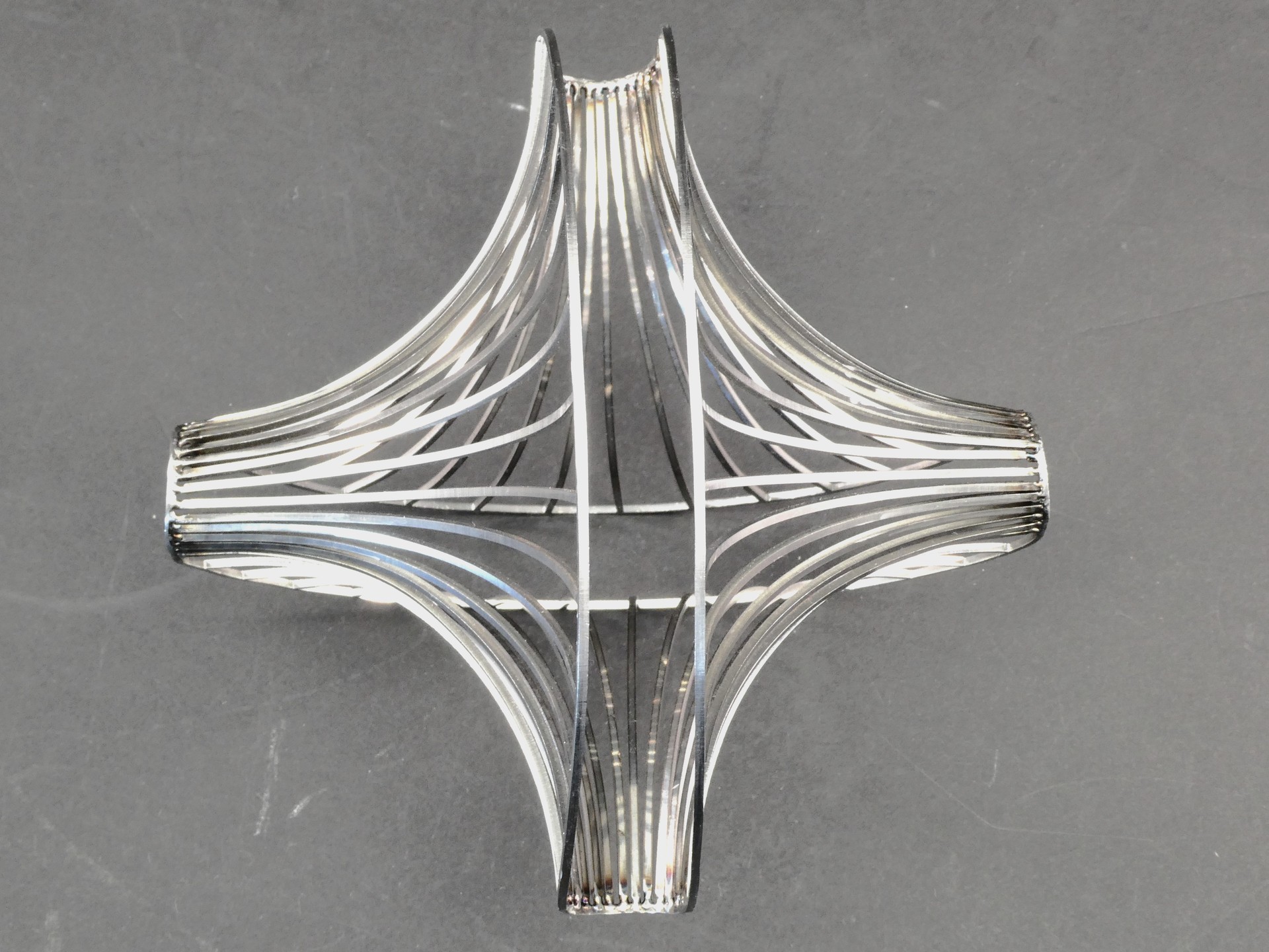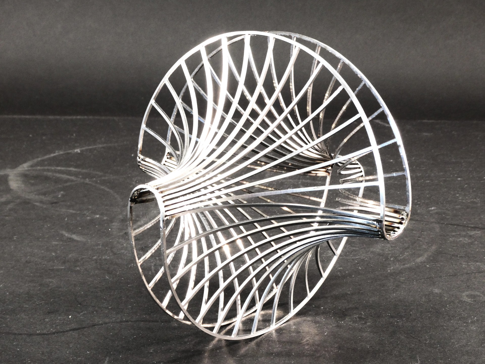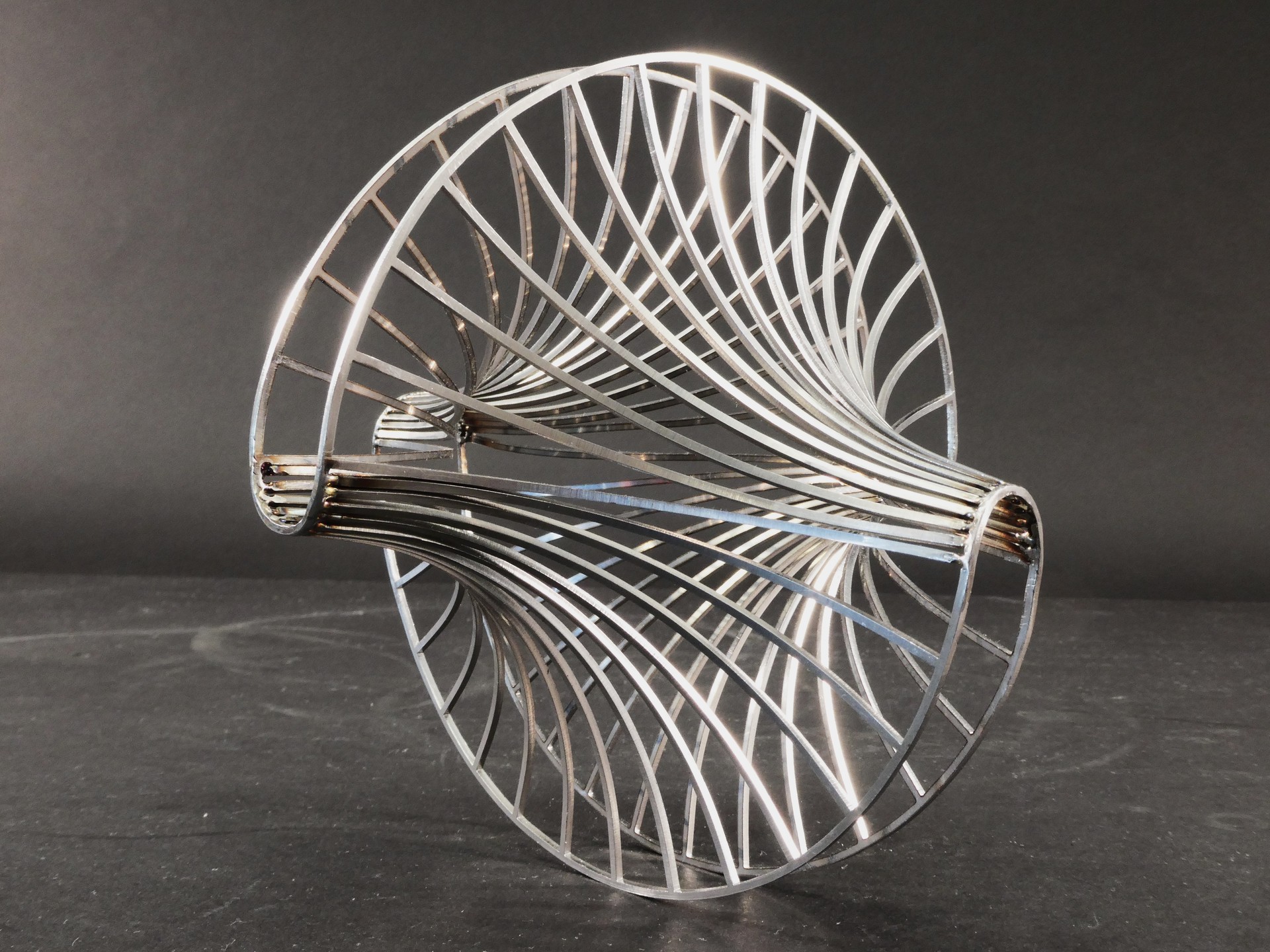 一般的にR曲げは、板の「表裏(平面内)」を基軸とした二次元的な曲げが主軸となります。しかし、この作品の核は、それに加えて「板厚方向(面外)」へのR曲げを複合し、一枚のステンレス板から自由曲面を立体成形した点にあります。この作品は、板のねじれとひずみを調整し、平面の切断面を連続した流線形の三次元曲面へと変化させることに成功しました。