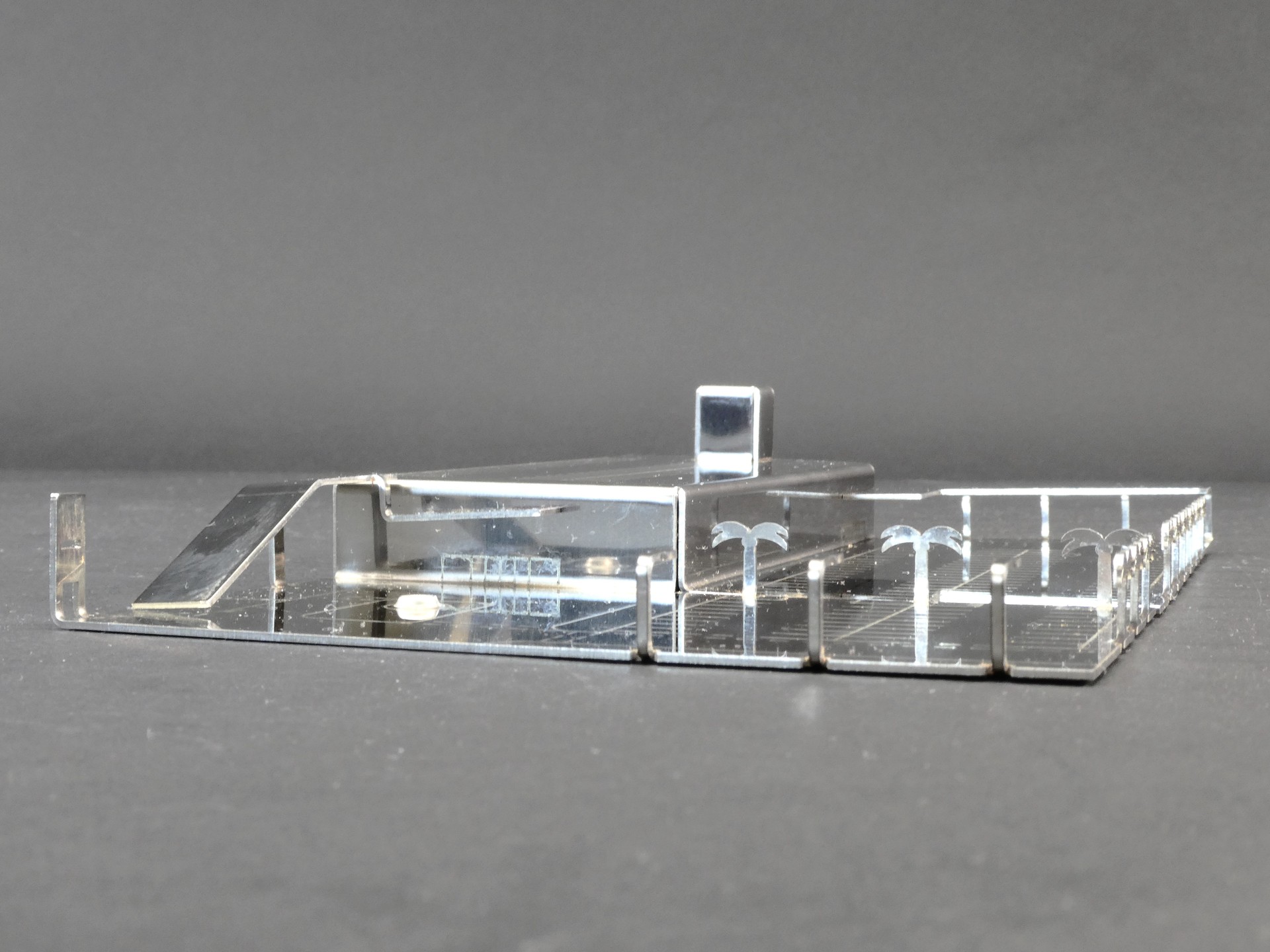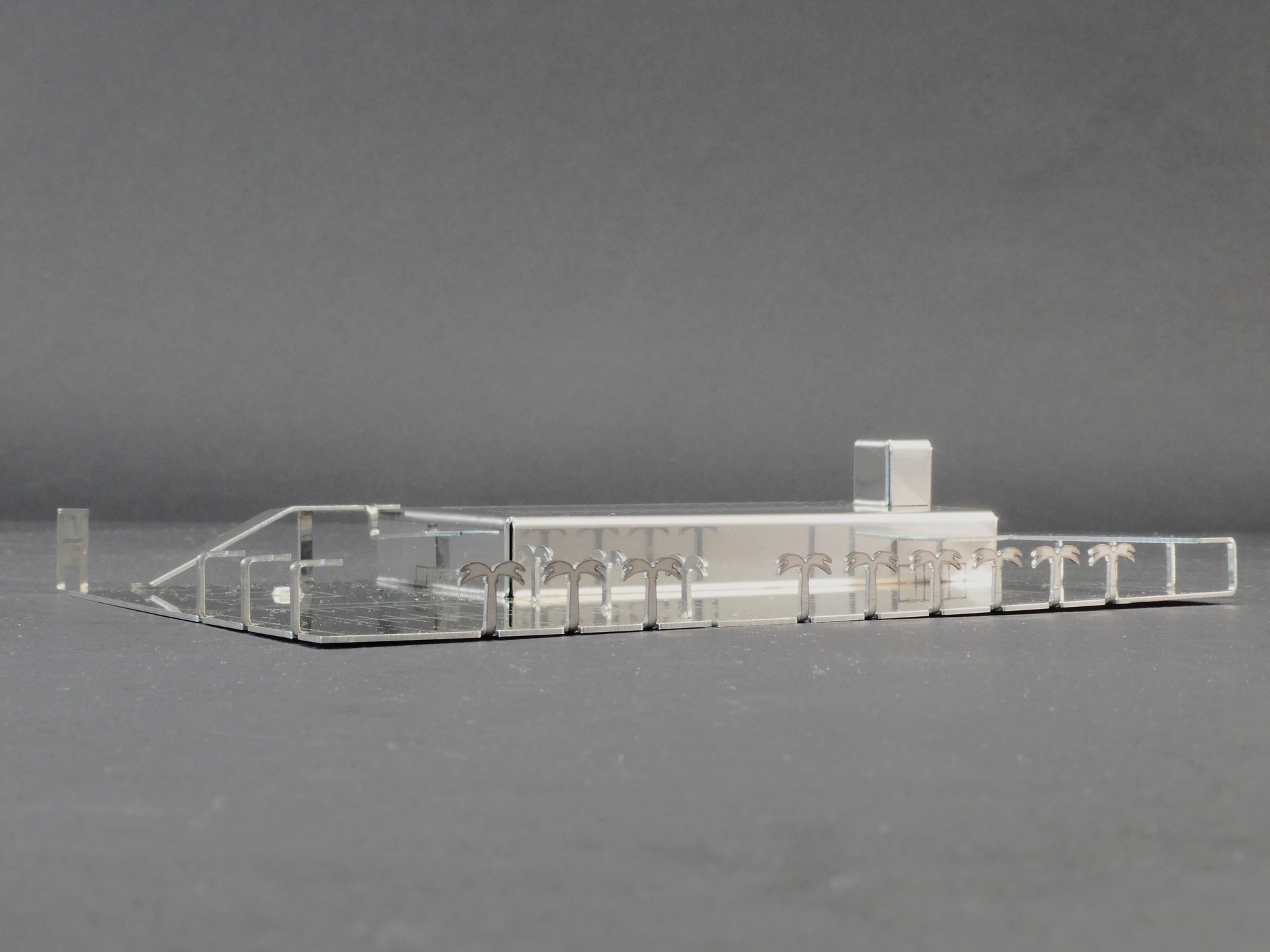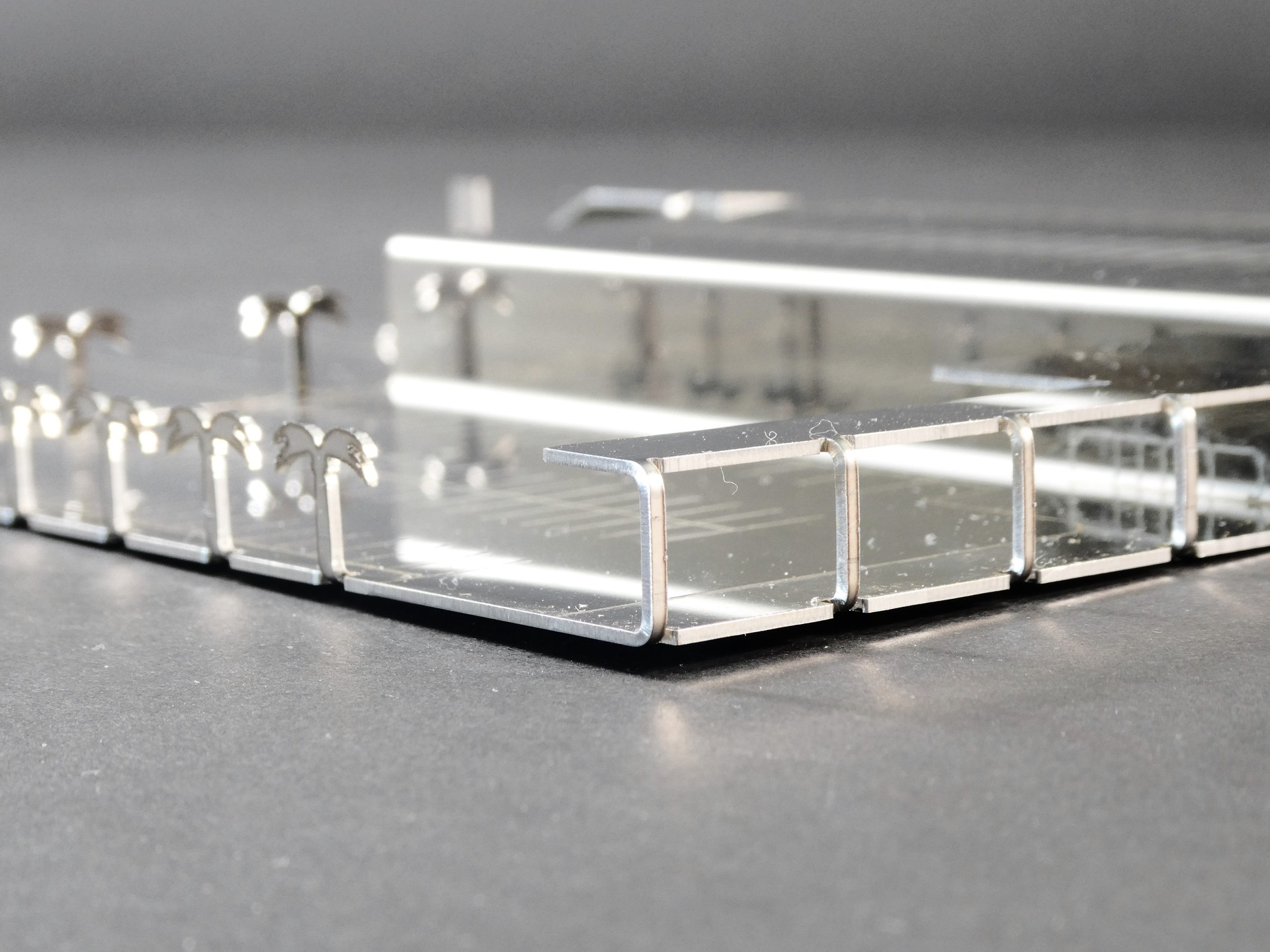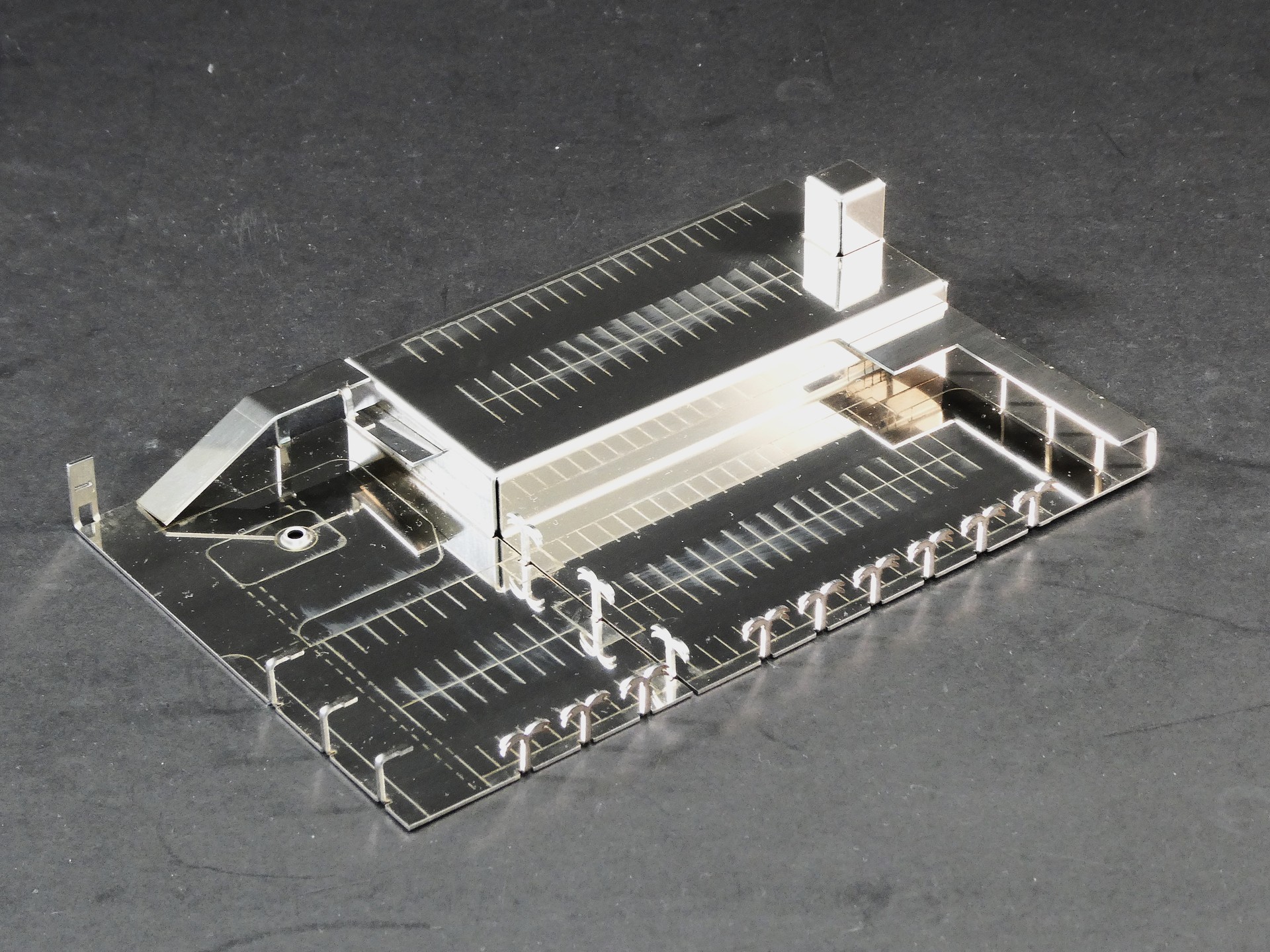 1枚の展開素板と弊社で通常用いる金型での加工から、ショッピングセンターをミニチュアで再現しました。