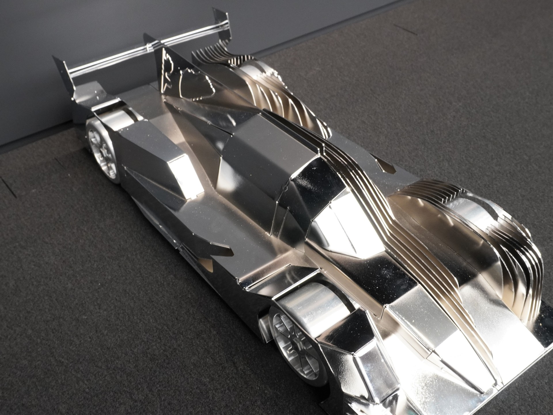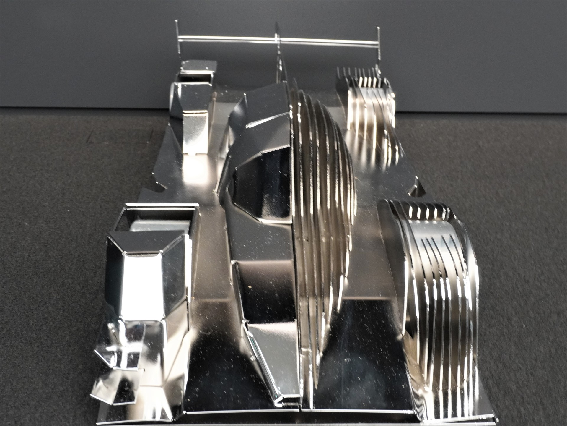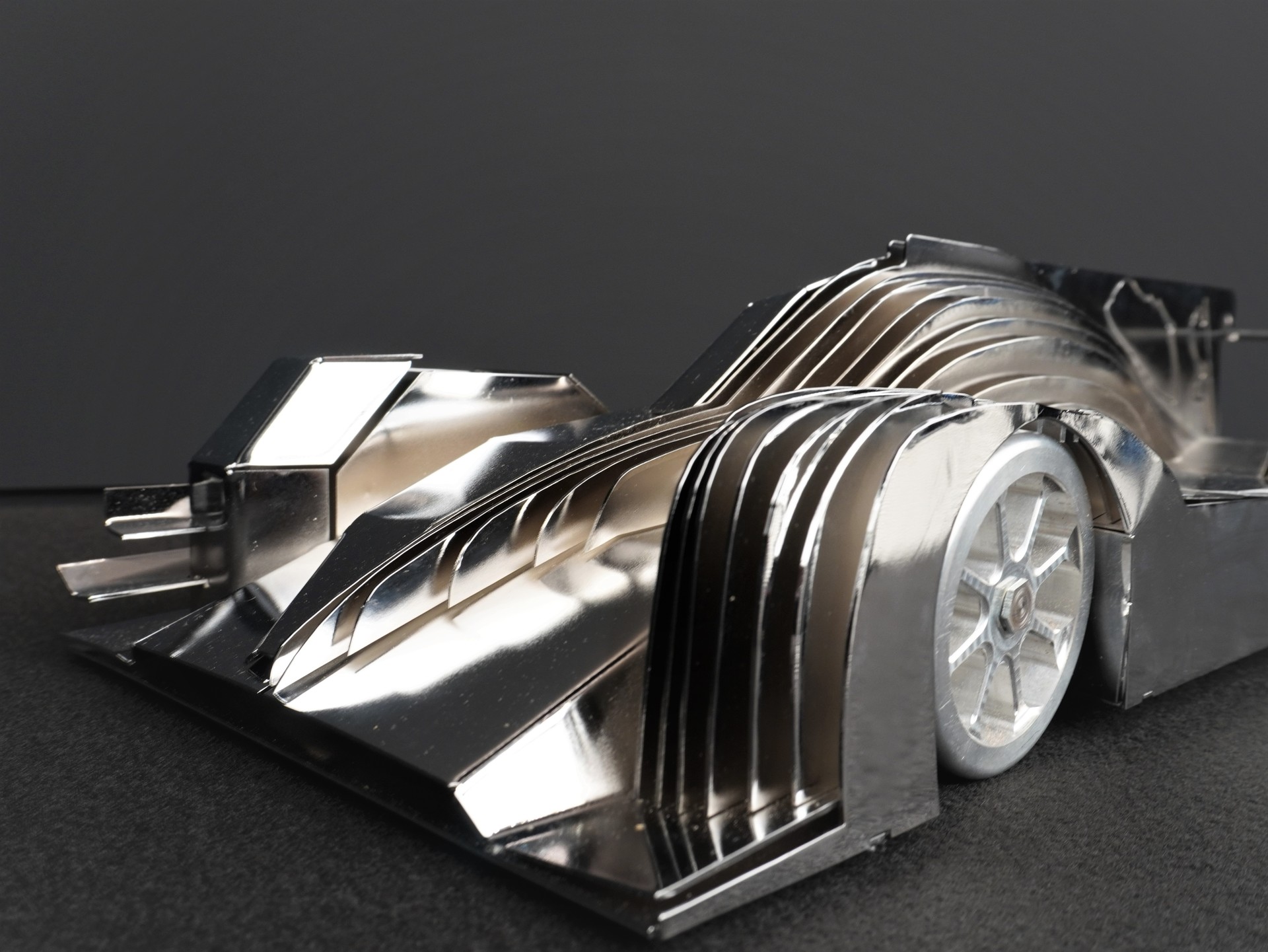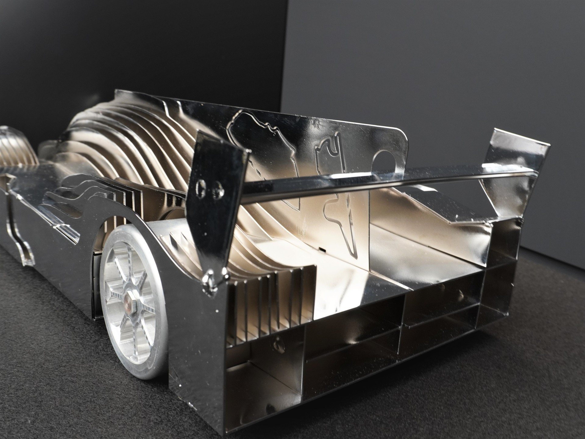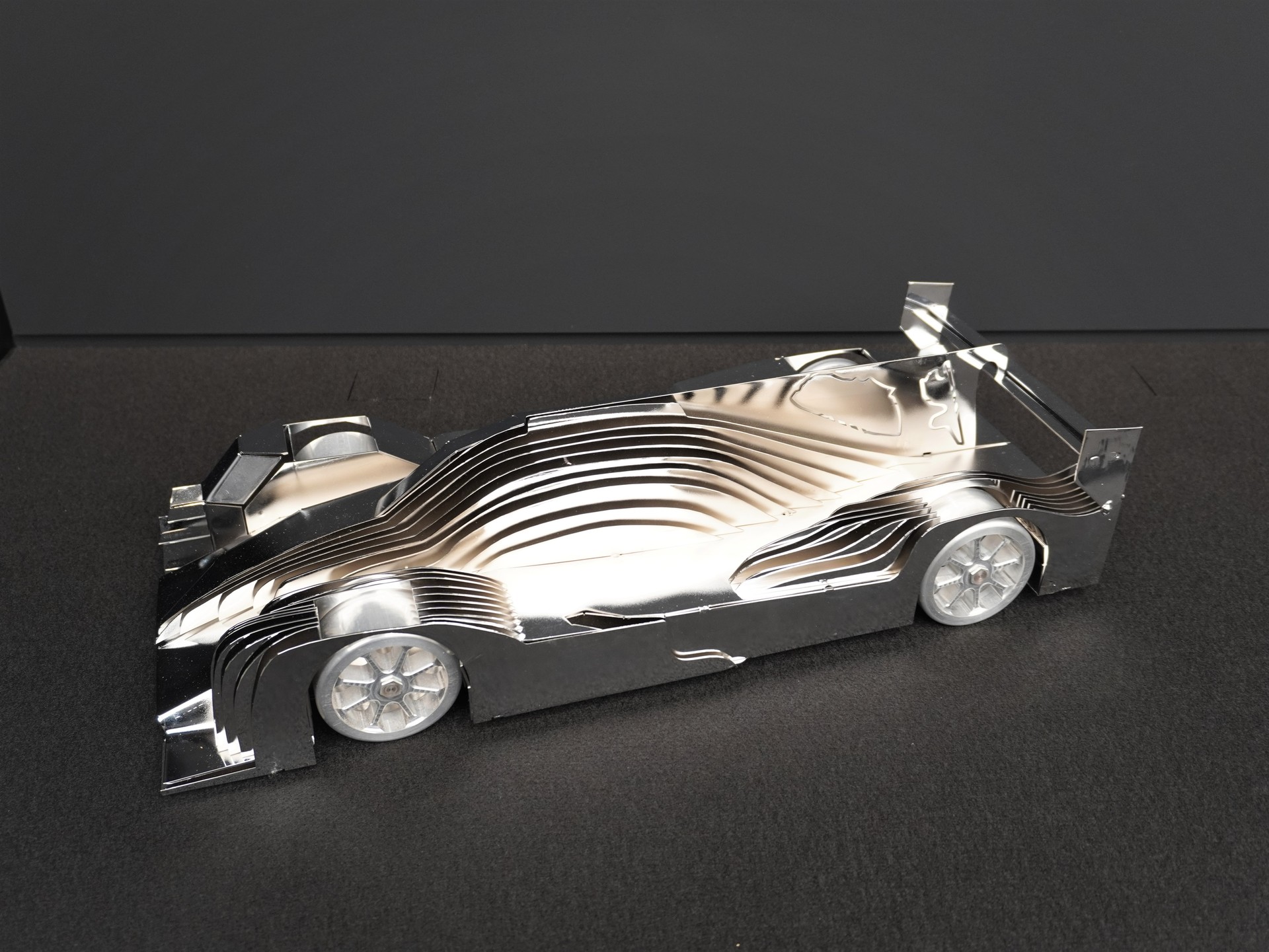 After researching the design of the work, the two students in charge of this project decided to build this car using two different methods: one half in “low-poly” and the other in “lamellar.” The 3D design was carried out with the software “SolidWorks,” under the constraint that all parts had to be either flat or folded (stamping was forbidden). The nesting of the parts required the use of a sheet metal plate with a maximum size of one square meter. The positioning of the parts relative to each other was achieved using mortise-and-tenon joints. The 82 parts were assembled by welding (spot welding with the MAG process). The four wheels were machined on a CNC lathe (CAD and CAM). The entire assembly was sandblasted before undergoing decorative chrome plating.