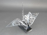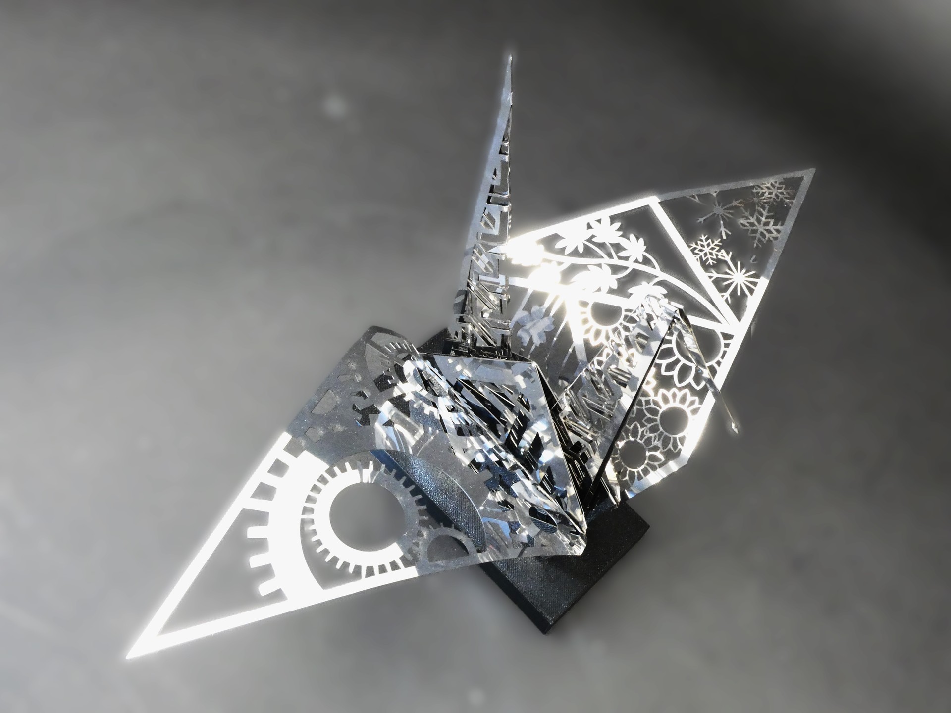 作品テーマを選んだ理由: 折り鶴は日本の伝統的なモチーフであり、平和の象徴として親しまれているからです。また、レーザー加工で紙以外の素材に繊細な形を表現し、技術と文化を組み合わせた作品にしたいと考えたからです。