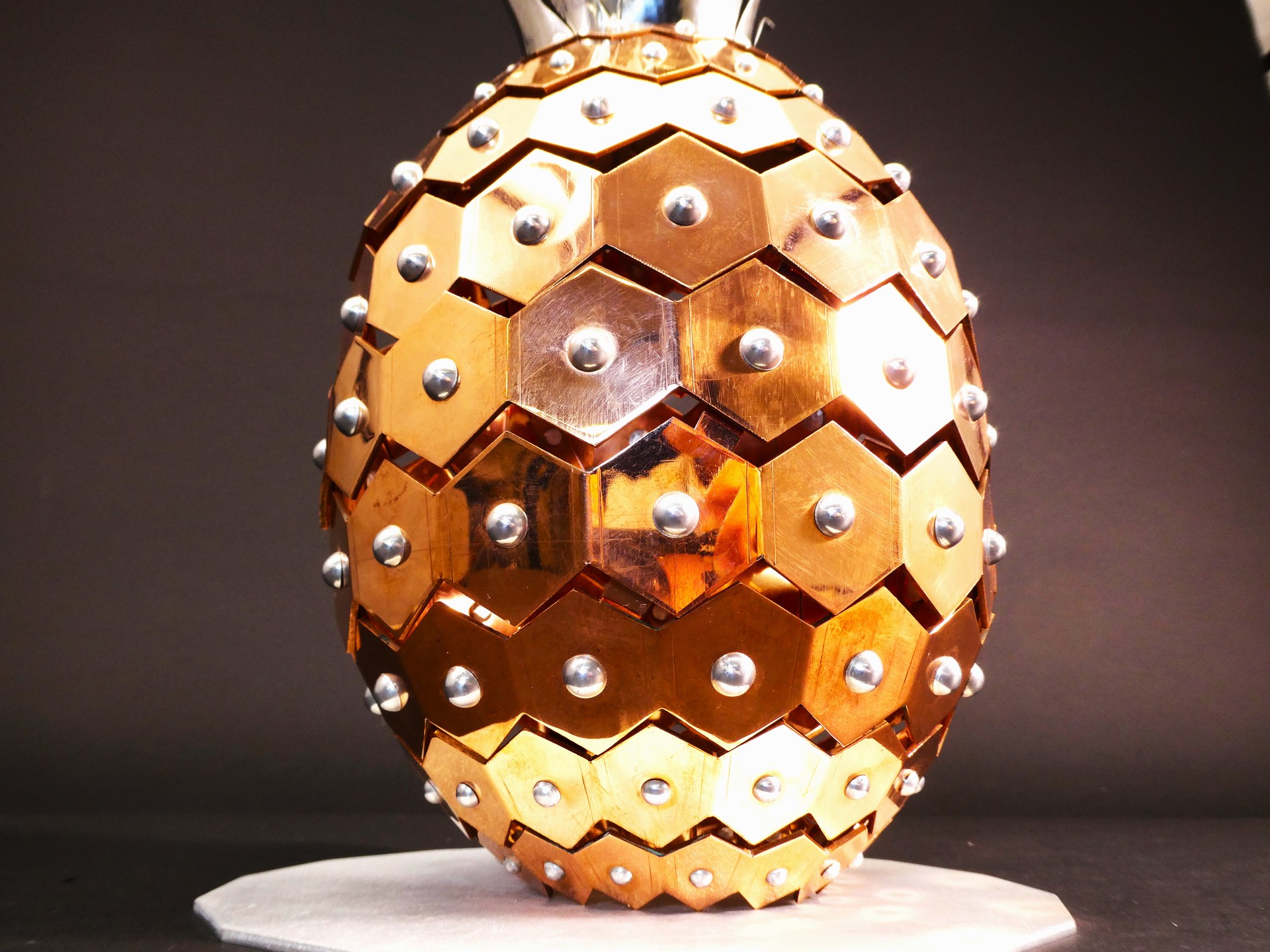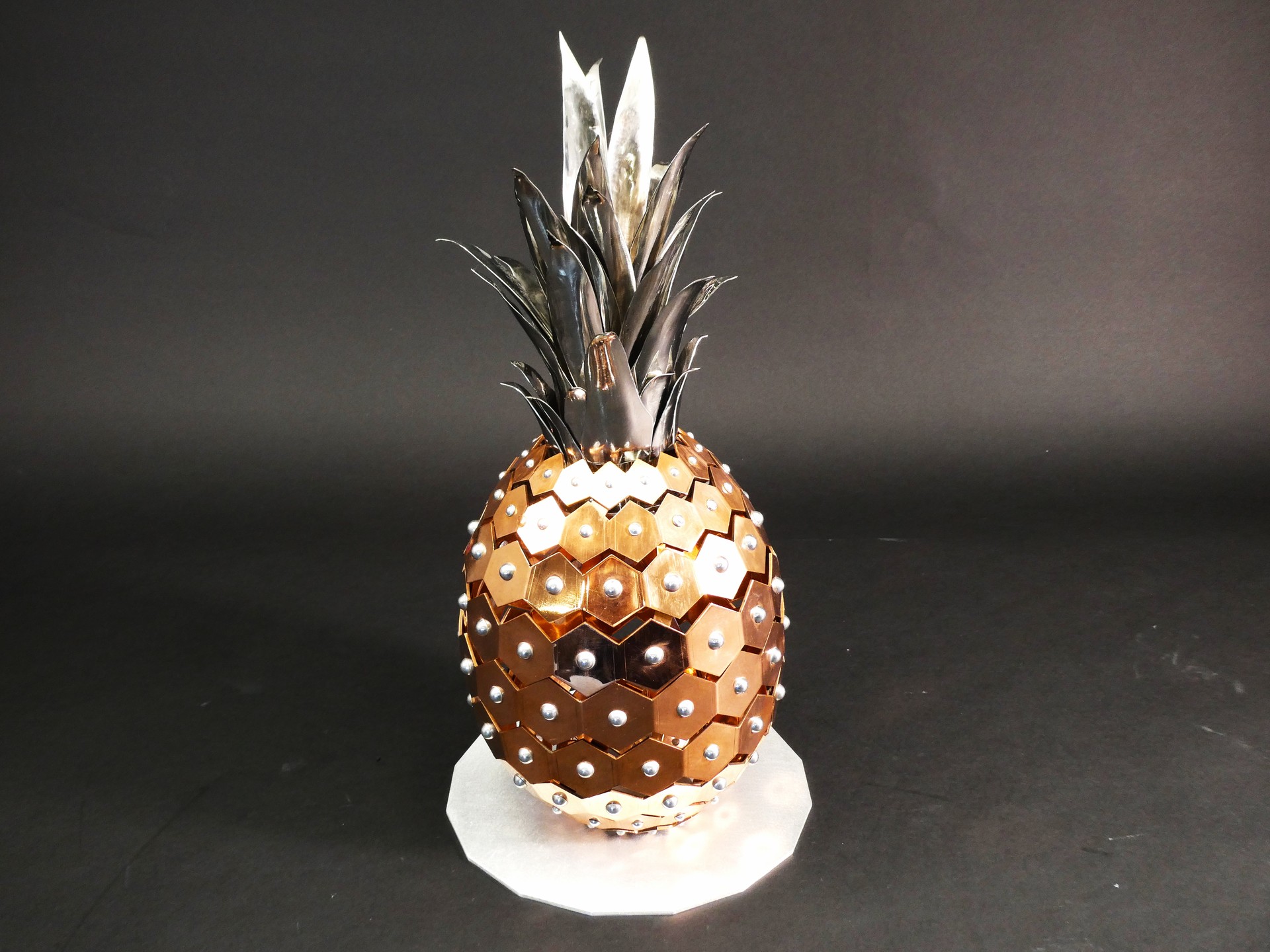 最も苦労した点や箇所: 手板金での加工が困難なステンレスの板材を、手工具を使用して3次元的に加工して、有機的なパイナップルの葉を表現すること。