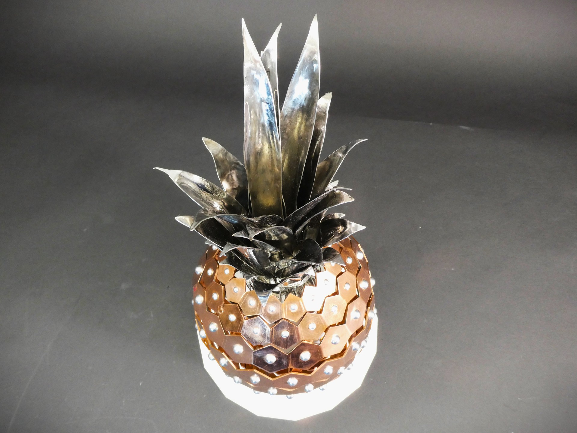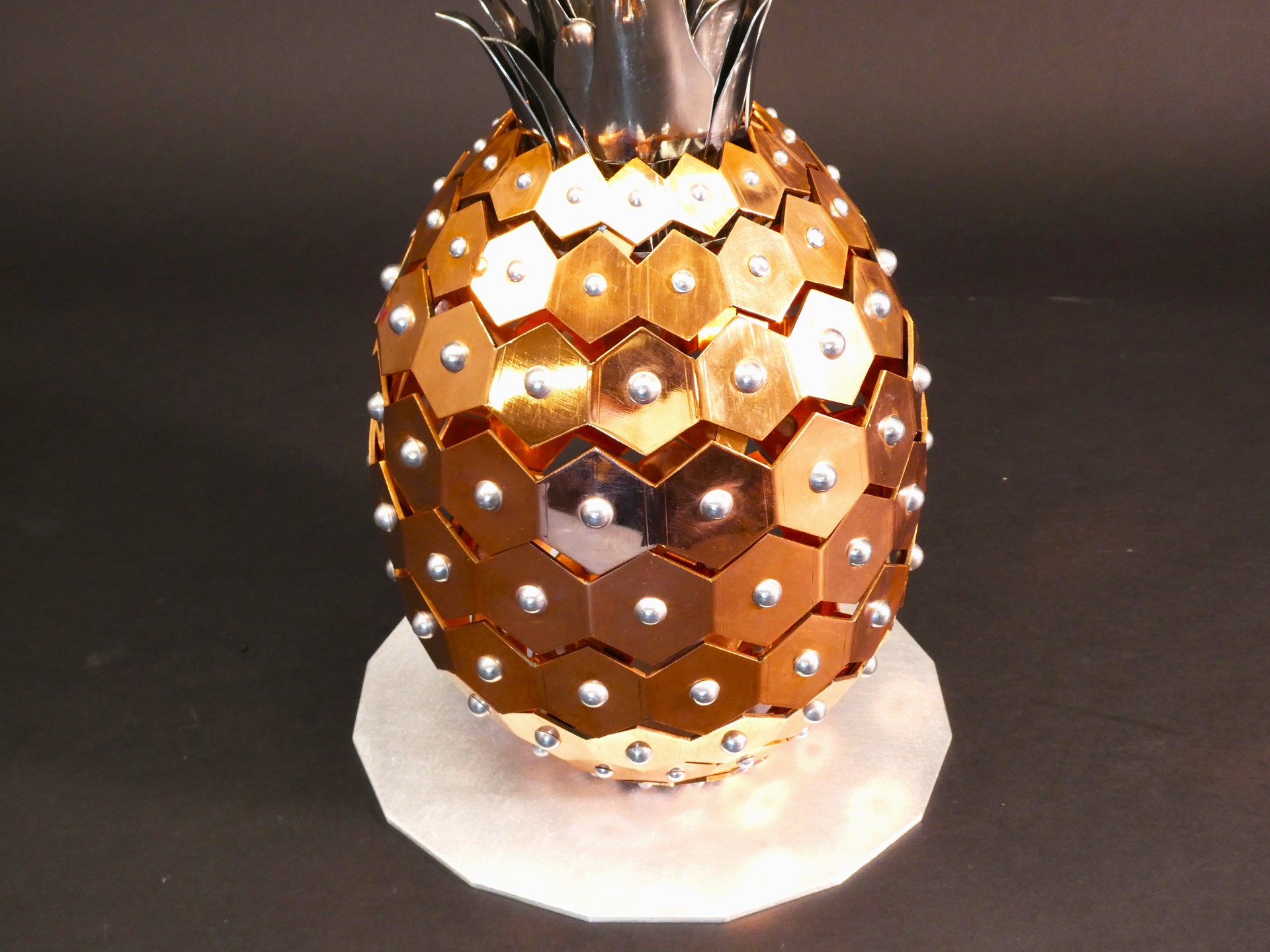 作品テーマを選んだ理由: 各種金属を板金工作機械と手工具を使用して、実物に近い迫力のある板金作品を制作することを目標に自然の曲線美等理由に「パイナップル」を選定した。