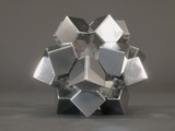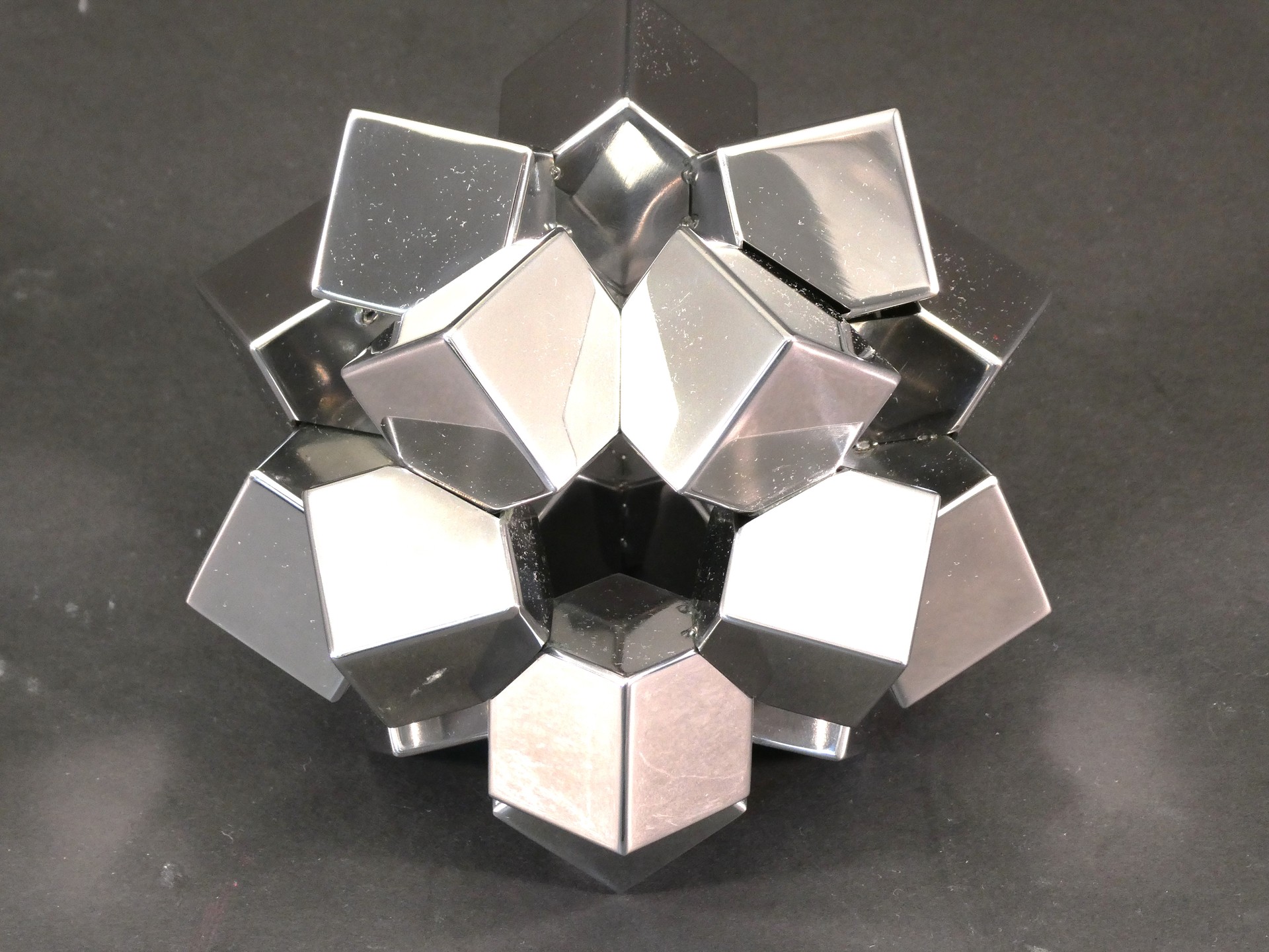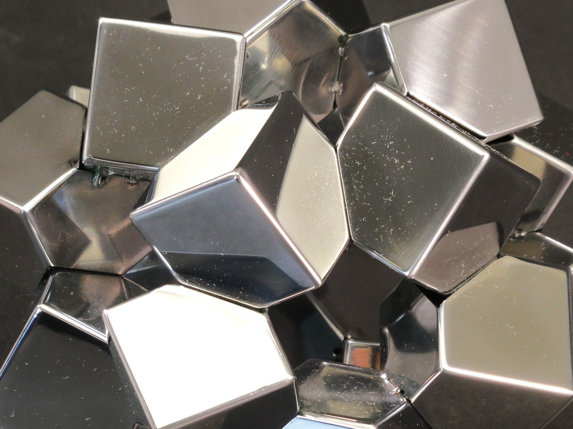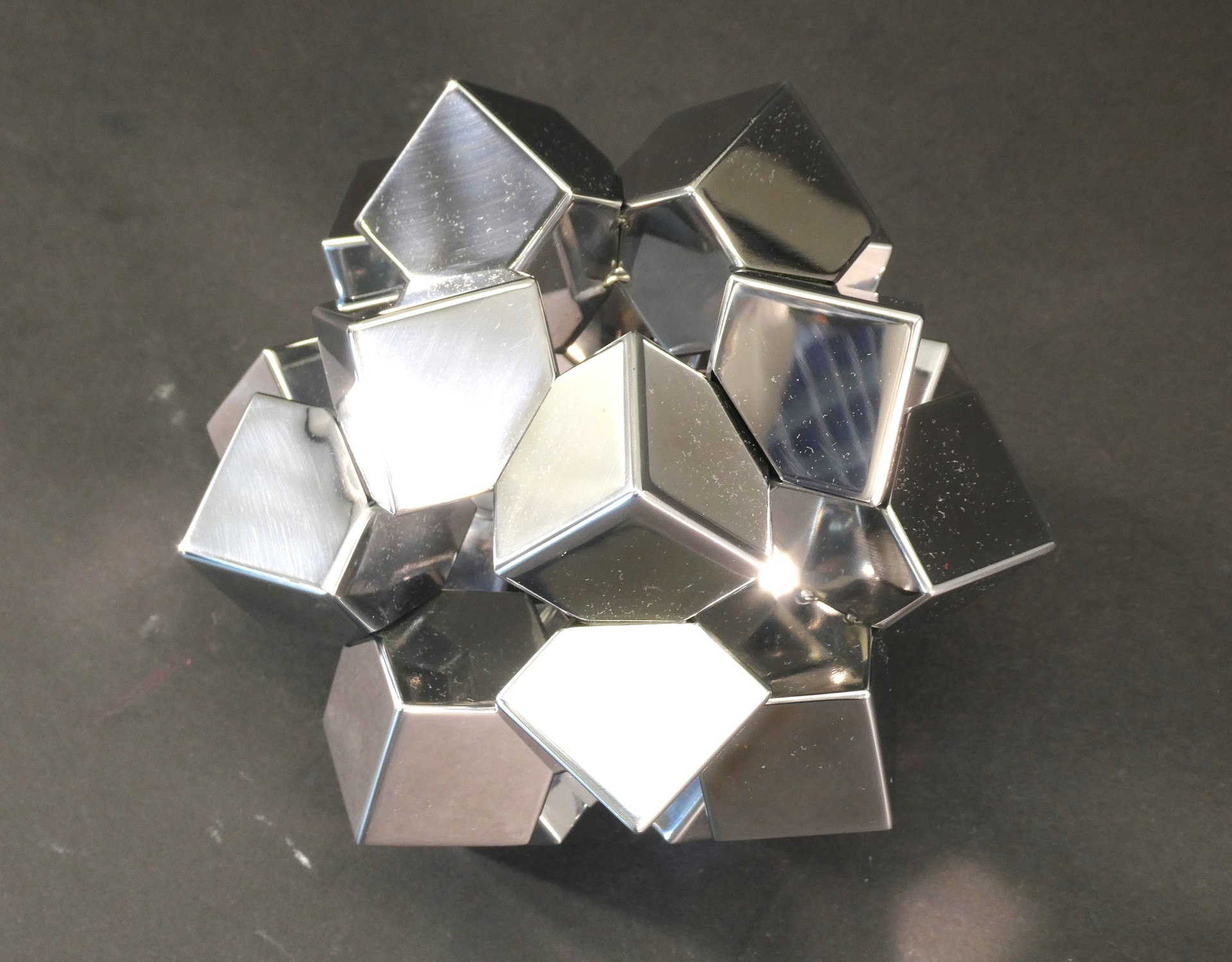 切り欠きが1箇所の立体を15個、3カ所の立体を5箇所、それぞれ2つの展開図から、曲げ、ファイバーレーザ溶接を行い、20個の立体を製作して、溶接して組み合わせました。