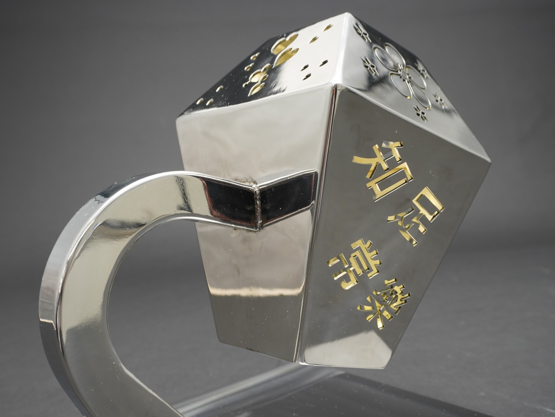 Laser cutting was used to create the Chinese characters on the cover and three sides of the body. Cutting, polishing, and drawing the characters demanded high accuracy. The symmetrical bending of the cover also posed a challenge, testing the craftsmanship and skill of the artist and lathe operator.