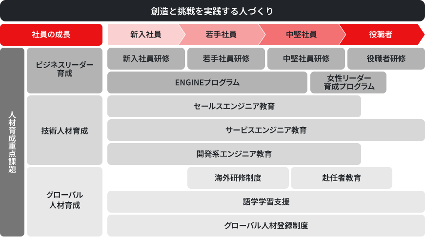 このような考えのもと、人材育成方針を「多様な人材の能力開発と自律的なキャリア形成支援」として、社員のキャリアステージやキャリア意向を踏まえた成長機会の提供や教育研修を行っています。人材育成の重要課題を「ビジネスリーダー」、「先端・専門分野における技術人材」、「グローバル人材」とし、あるべき姿を目指した育成強化に取り組んでいます。